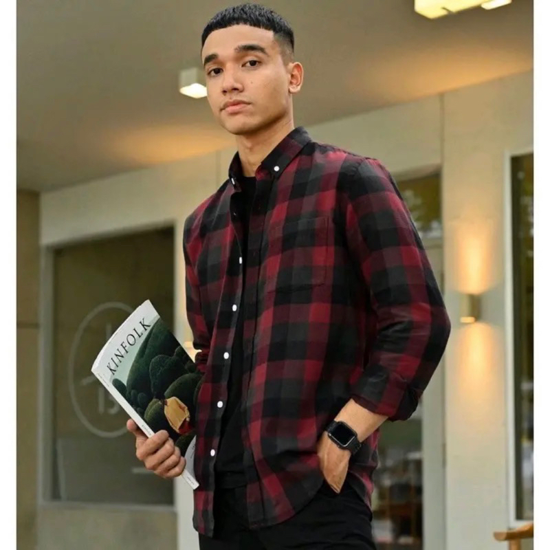 Kemeja flanel pria kualitas Premium Lengan Panjang Motif Kotak Kotak