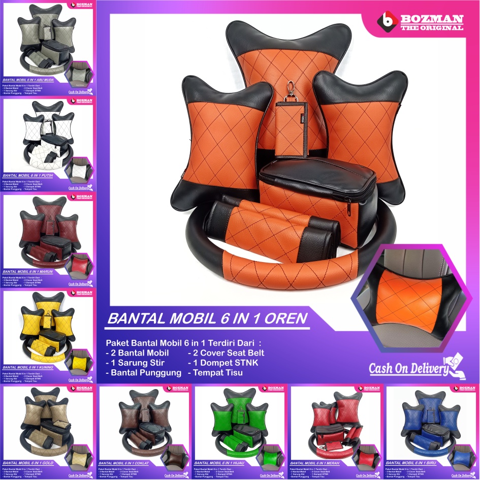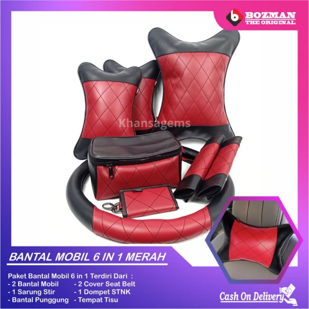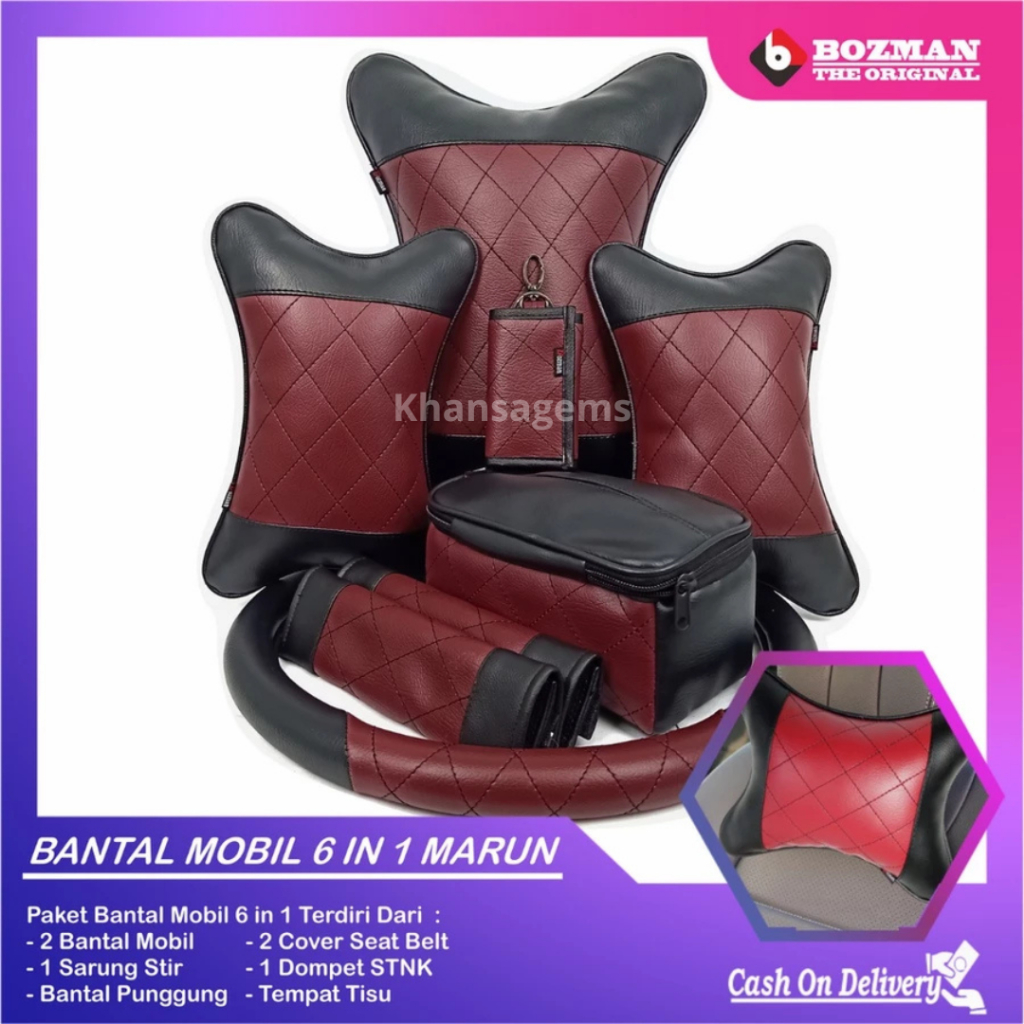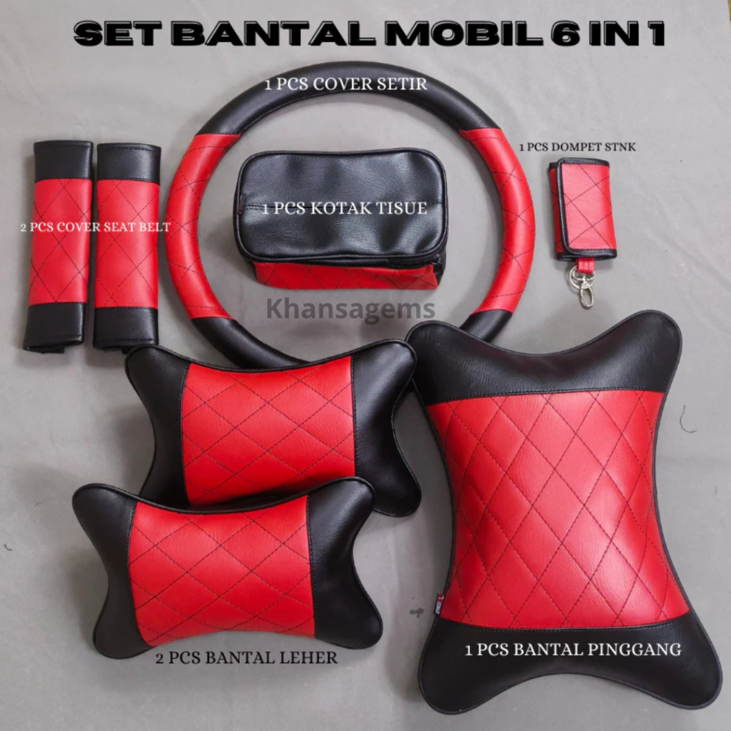 Set Bantal Mobil 6 in 1 Premium Bantal Leher Pinggang Cover Stir SeatBelt Tempat Tisu Free Dompet STNK