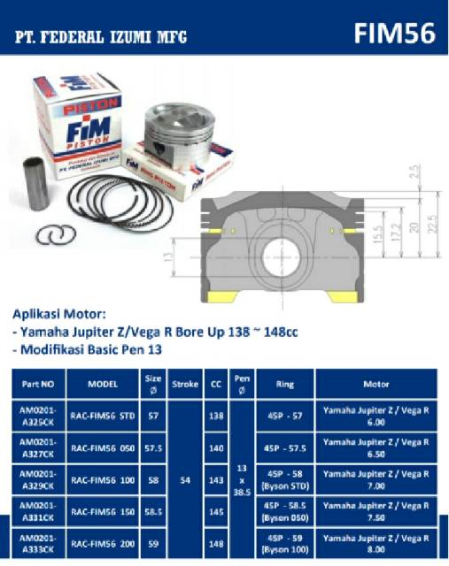 Piston kit FIM Boreup 150cc Jupiter Z Burhan | Vega R New XXB Pen Pin 13 DM 57 | 57.5 | 58 | 58.5 | 59 mm