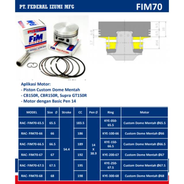 Piston Kit KLX dan motor basic Pen Pin 14 DM 65.5 | 66 | 66.5 | 67 | 67.5 | 68 mm Dome Mentah