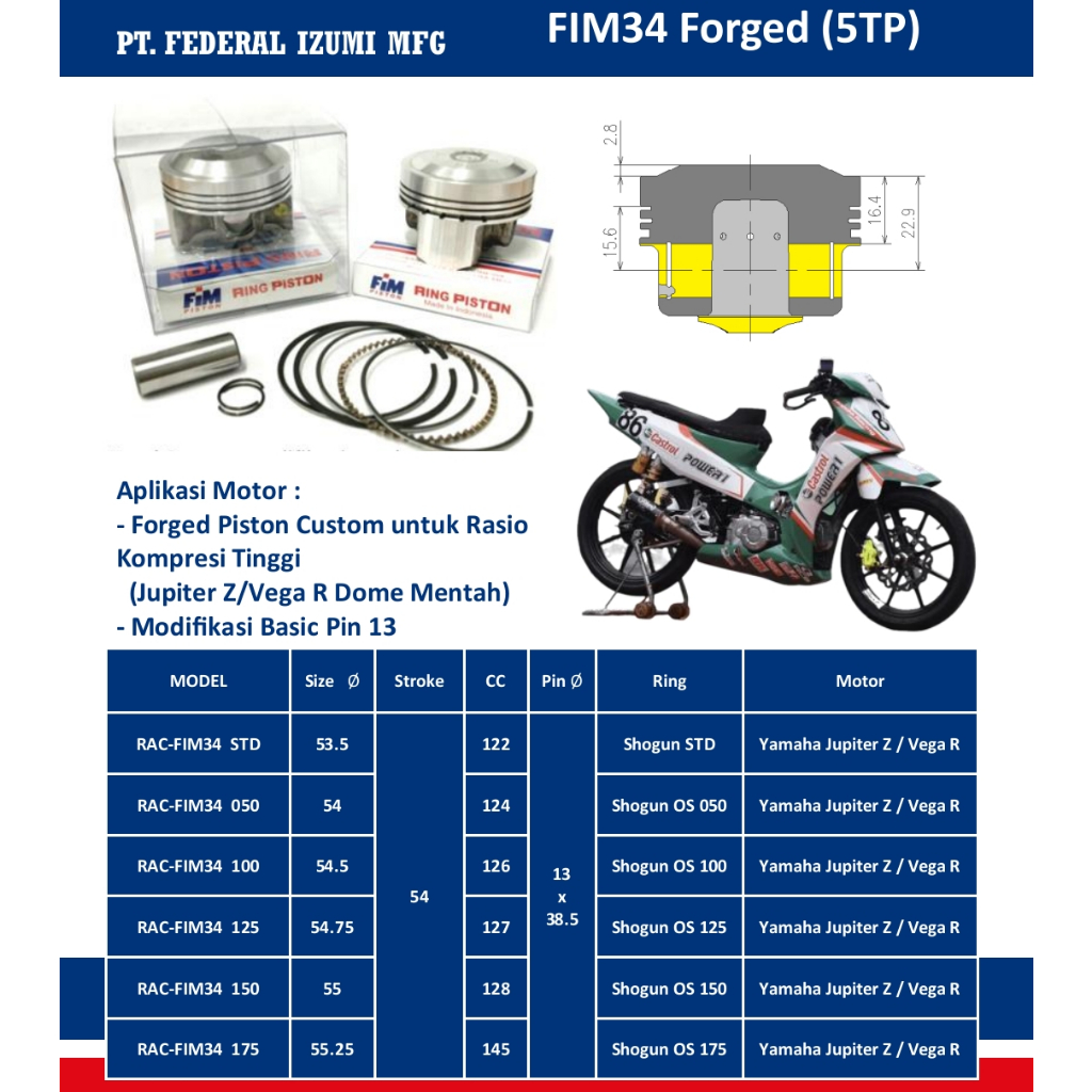 Piston Kit FIM Forging Jupiter Z, Vega R Dome Mentah Pen Pin 13 DM 53.5 | 54 | 54.5 | 54.75 | 55 | 55.25 mm