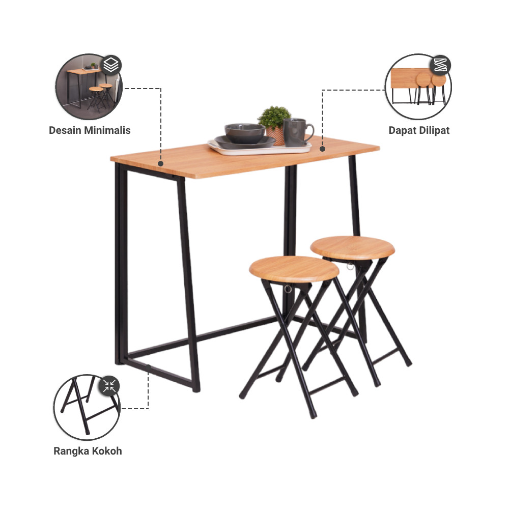 Set Meja Makan Lipat 2 Kursi - Hitam/Cokelat Oak Dining Table Set Foldable Meja Kursi Ruang Makan Aesthetic