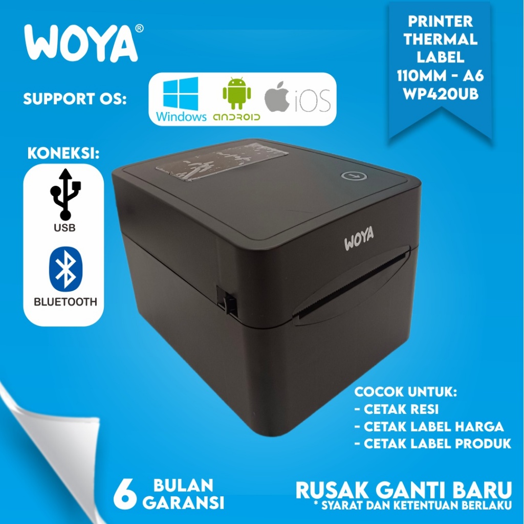 WOYA PRINTER BARE THERMAL LABEL ALAT MESIN RESI PENGIRIMAN MARKETPLACE TOKO JUALAN ONLINE SHOP A6-110MM KONEKSI USB - BLUETOOTH