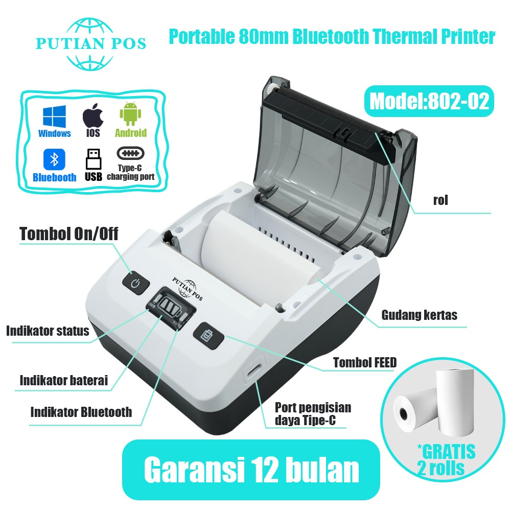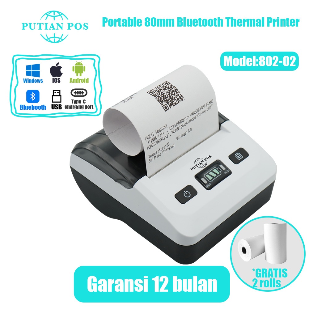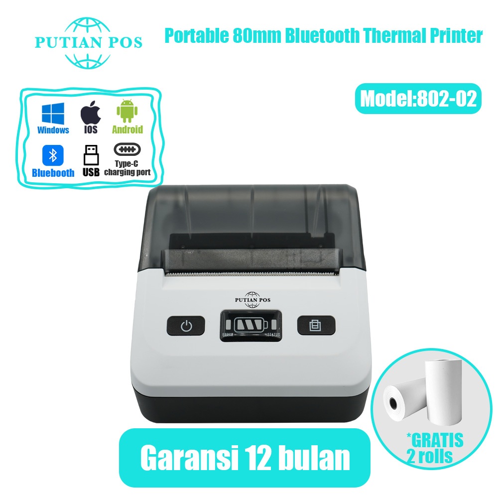 Printer Termal Bluetooth Portabel PUTIAN POS 80mm 802-02 untuk Toko Online (Dengan Baterai)