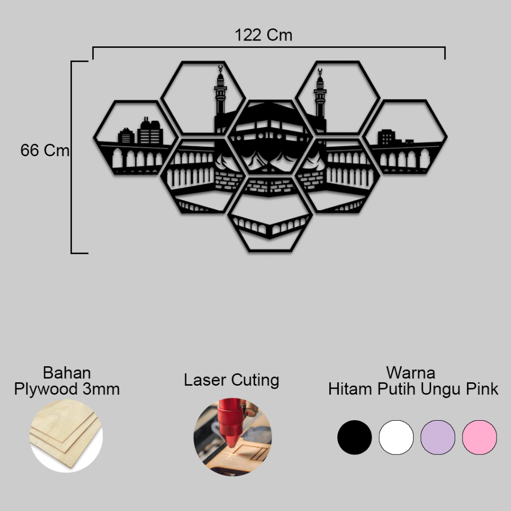 Pajangan dinding kayu dekorasi ruangan minimalis Motif Ka'bah kaligrafi islami Hiasan rumah aesthetic hexagon 1set isi 8