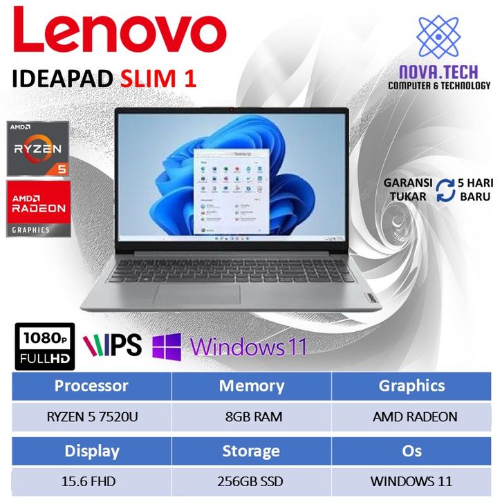 Lenovo Ideapad Slim 1 15 Laptop Murah Ryzen 5 7520u Ram 8gb 256gb Ssd Windows 11 Layar 15.6fhd ips