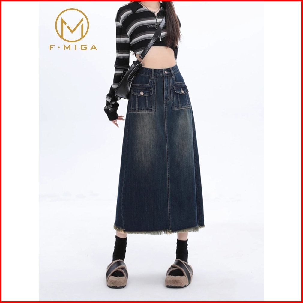 F Miga C103 Denim Rok Jeans Highwaist Midi Wanita Tepinya Berbulu - Biru Retro