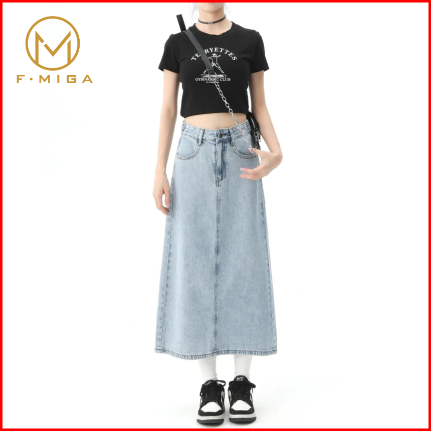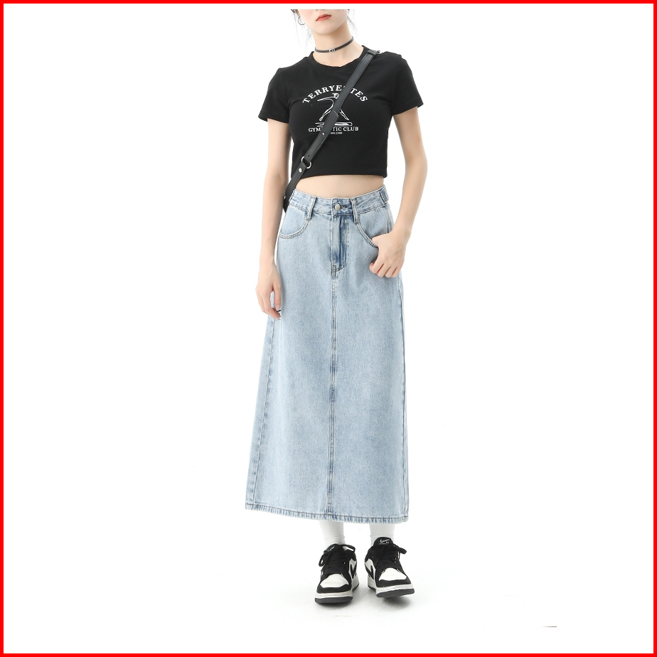 Rok Wanita Jeans Bersilang Blue Light 2024 Trend Musim Panas Tinggi Langsing Menutupi Pinggul Dress Panjang Sedang