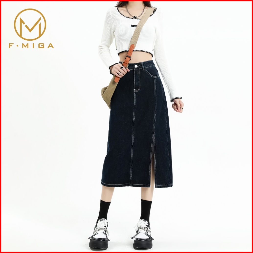 F Miga C123 Korean High Waist A-line 3 4 Denim Rok Jeans Midi Wanita - Biru Tua