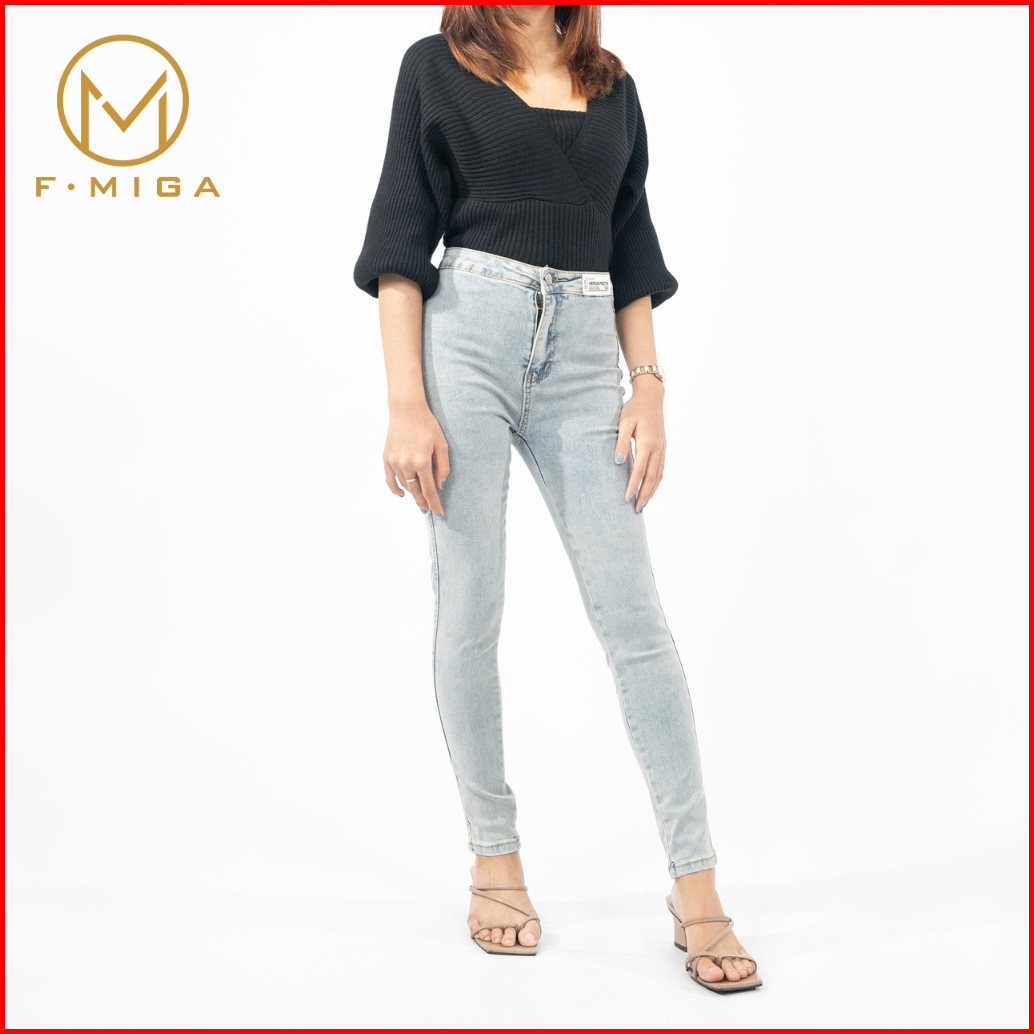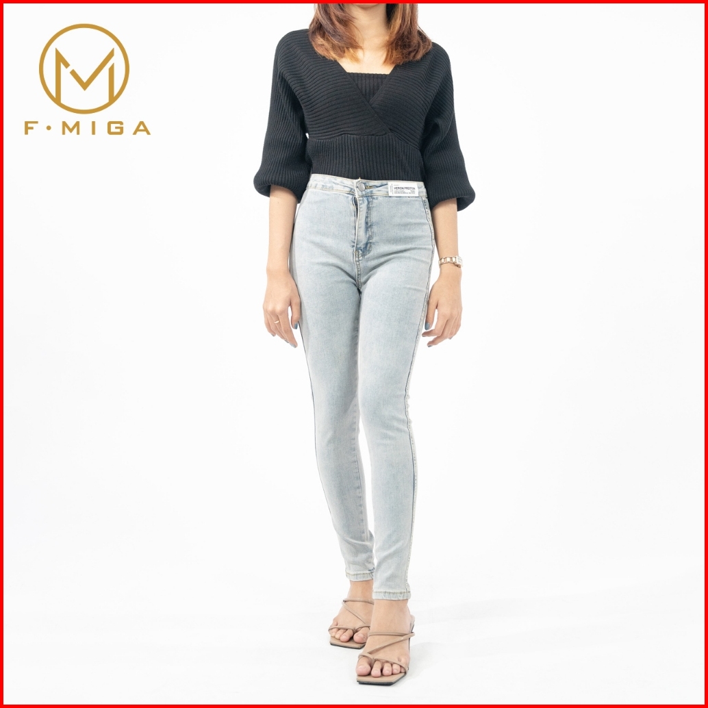 F Miga C163 Korean Style Highwaist Stretch Celana Jeans Panjang Wanita - Biru Muda