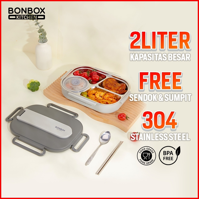 4 Jam Hangat Bonbox Kitchen Lunch Box 304 Stainless Steel 2000 Ml Anti Bocor Tas Bekal Sekolah Kantor Kotak Makan Bte412