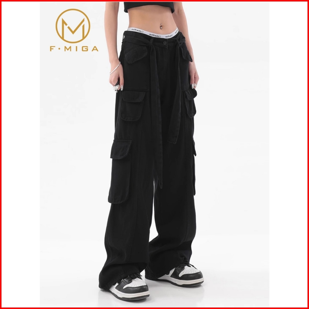 F Miga C111 Celana Cargo Jeans Wanita Highwaist Korean - Hitam