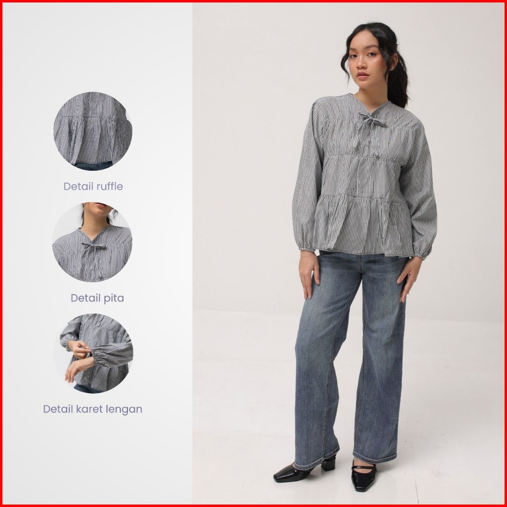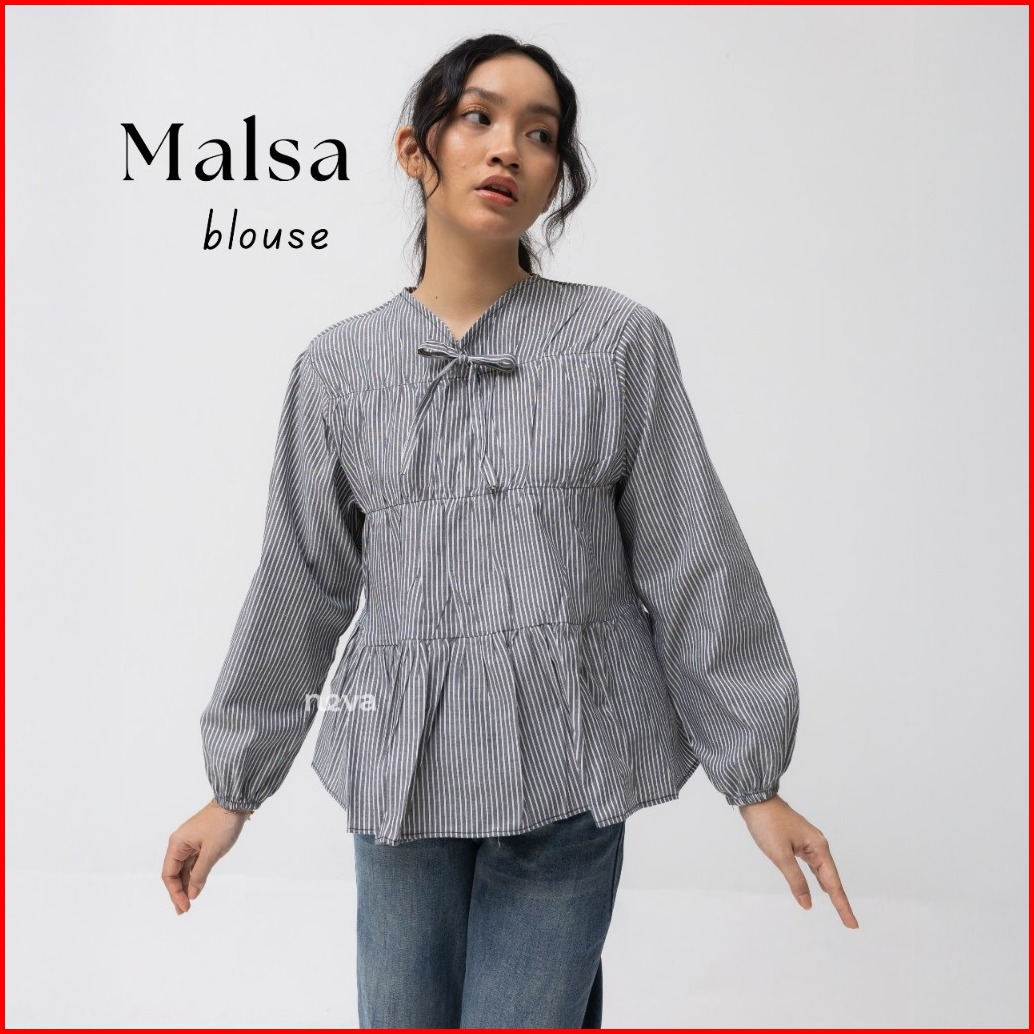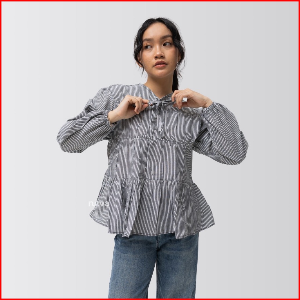 Neva Style - Malsa Blouse Katun Salur Wanita Rubber Blouse Stripe Cotton Kemeja Lengan Balon
