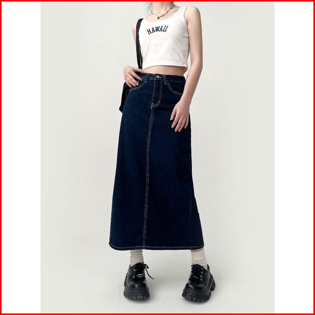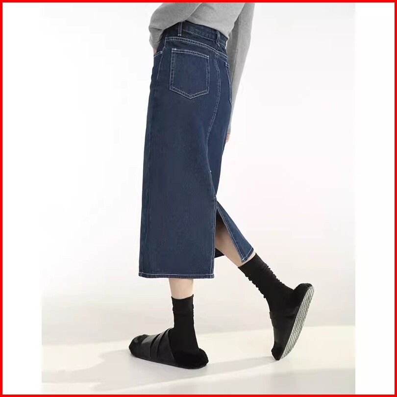 Rok Jeans Wanita Vintage Semi High Waist Slim Fit Flared Midi Skirt With Slit For Spring 2025