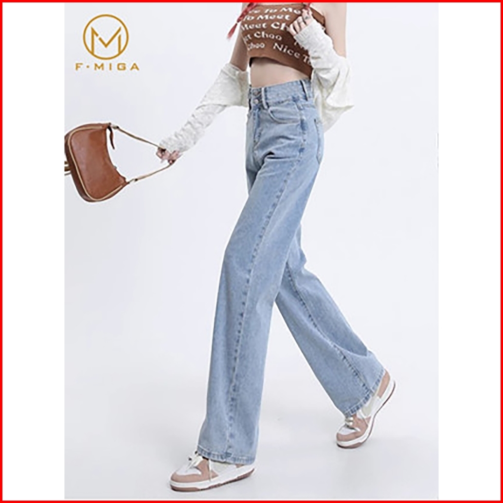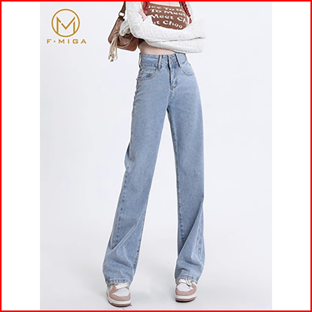 F Miga C23 2025newstyle Highwaist Wanita Jeans Celana Panjang Berkancing Ganda Straight Korean Biru