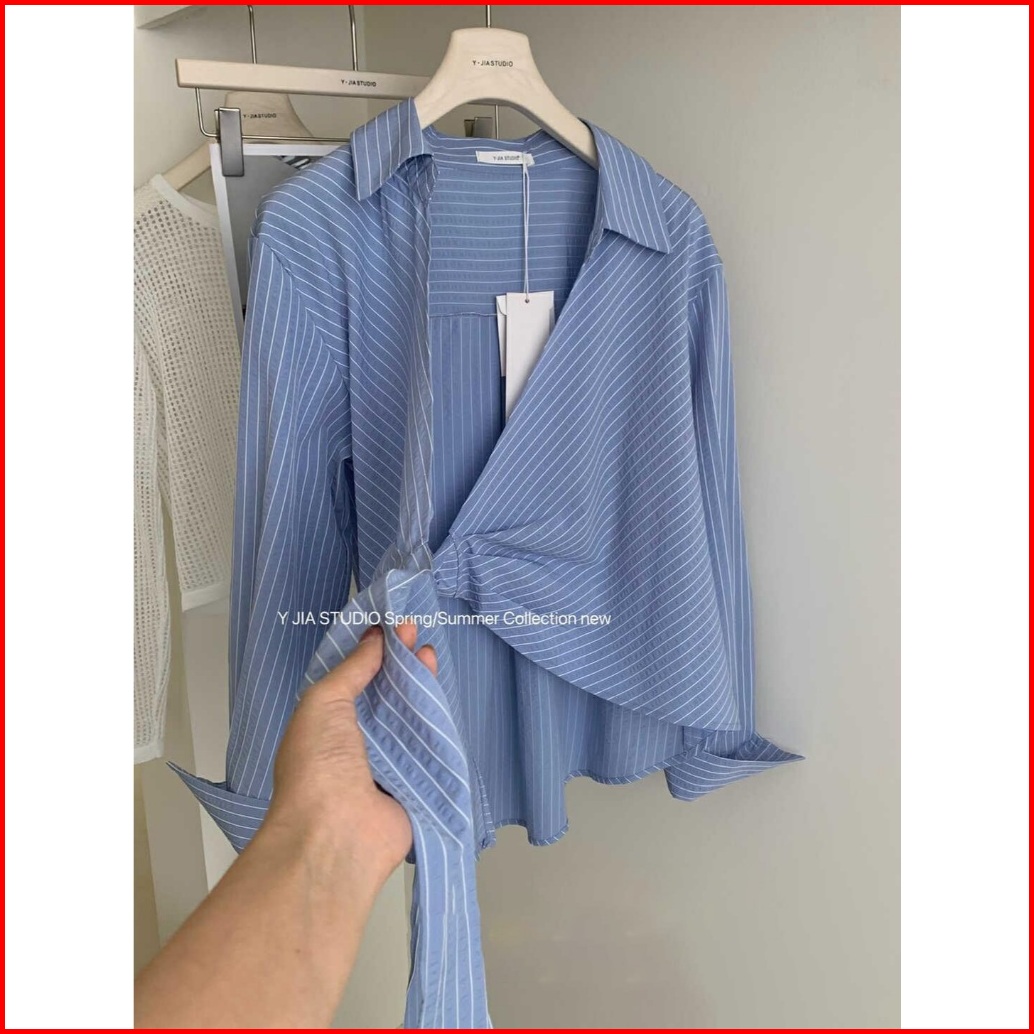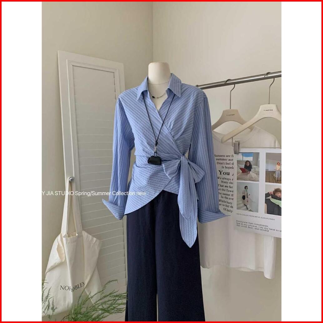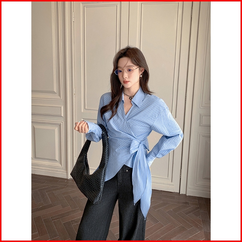 Blus Lengan Panjang Bergaris Biru Dan Putih Korea V-neck Desain Gaya Cece-up Waist Wanita Atas Kemeja