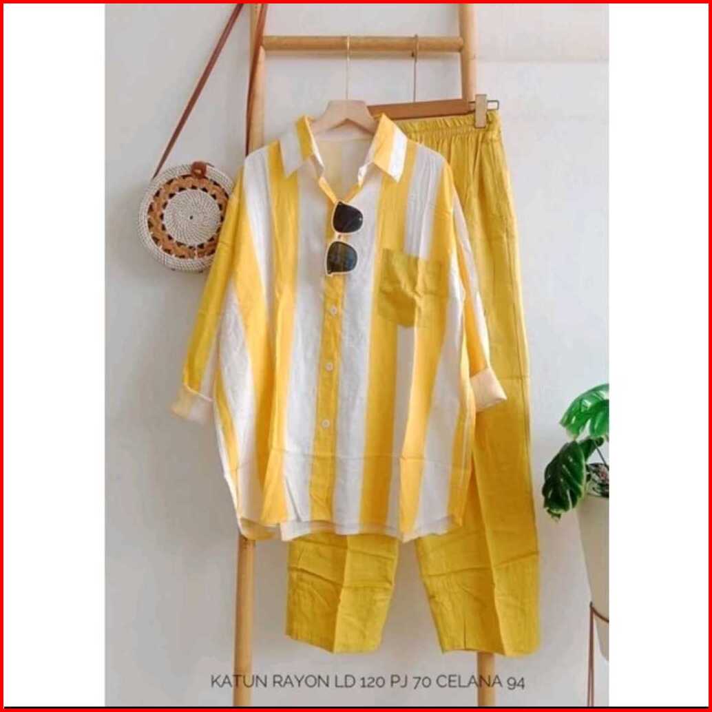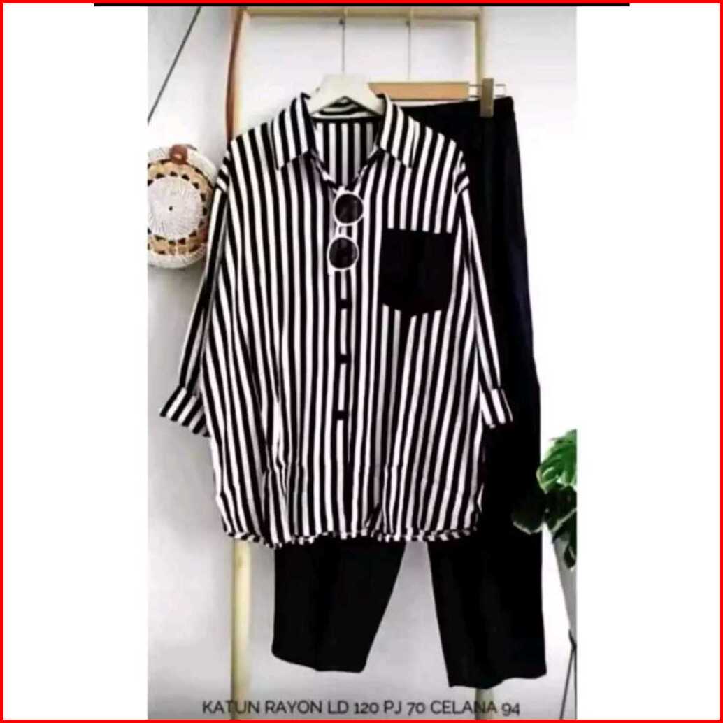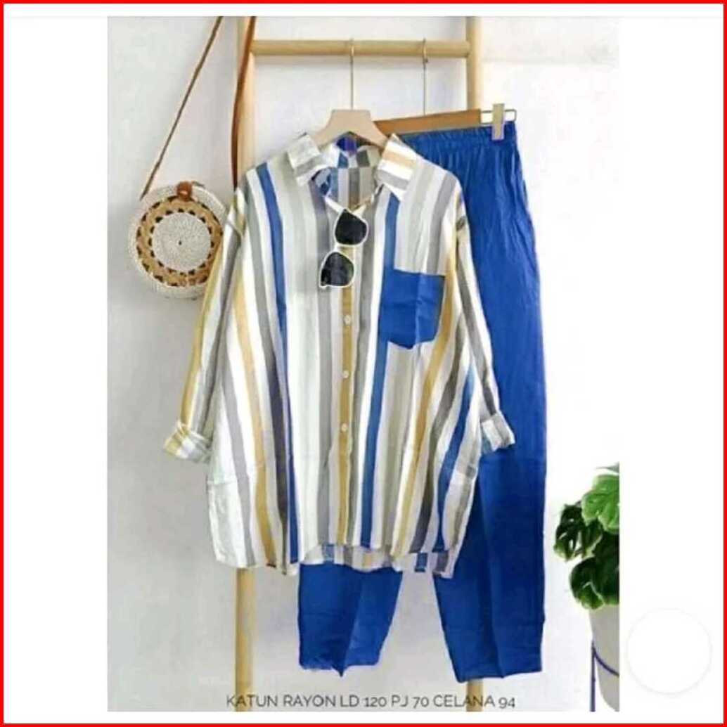 One Set Import Premium Setelan Wanita One Set Salur Lengan Panjang Setelan Wanita Terbaru Setelan Kemeja Kekinian Rayon