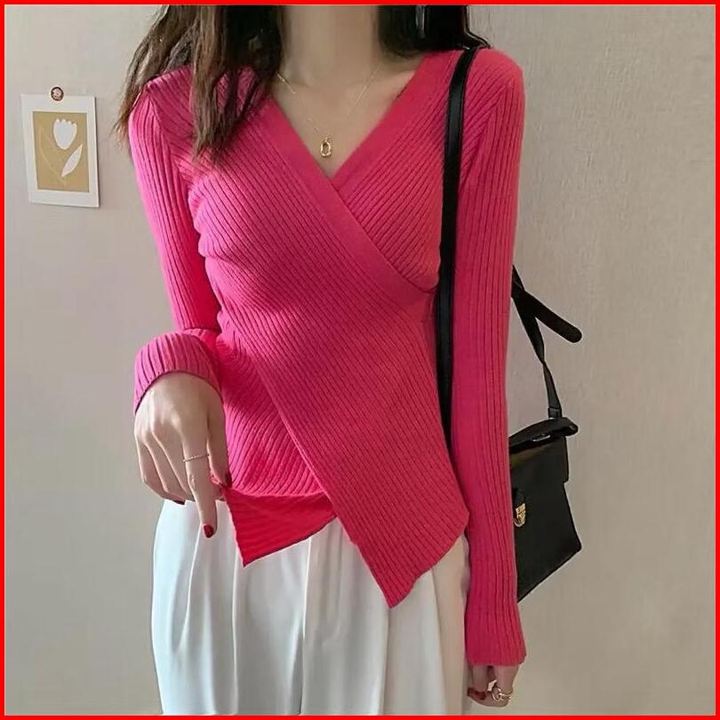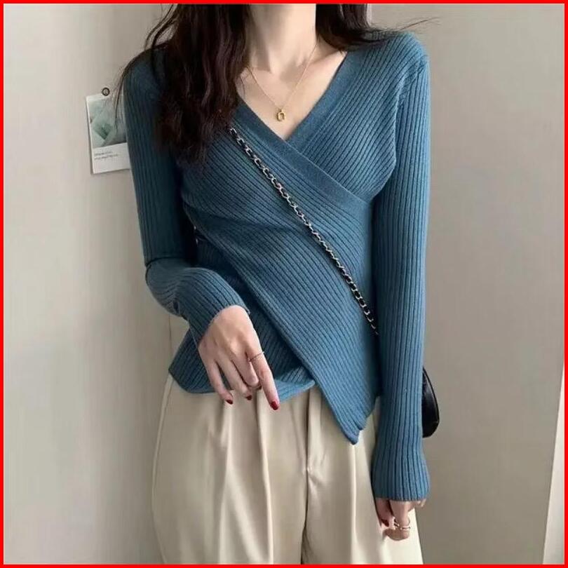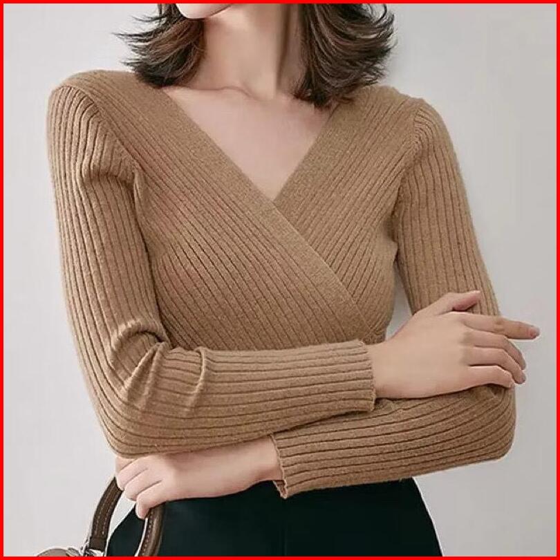 Keisya Baju Sweater Wanita V-neck Gaya Korea Knit Wrap Top Polos Lengan Panjang Wanita Rajut Korea Style Vv Sweater