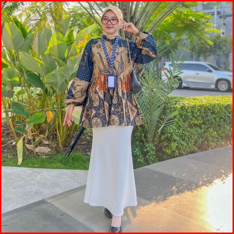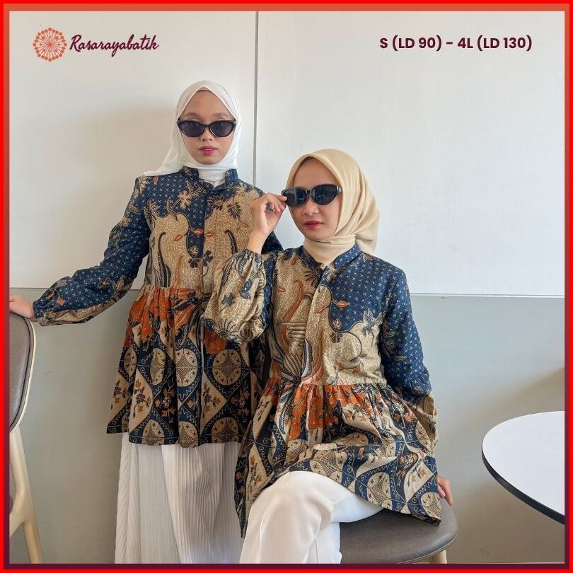 Rasaraya Batik Gamila Blouse Wanita Katun - Atasan Batik Kerja Motif Klasik Navy Donker Coklat Busui