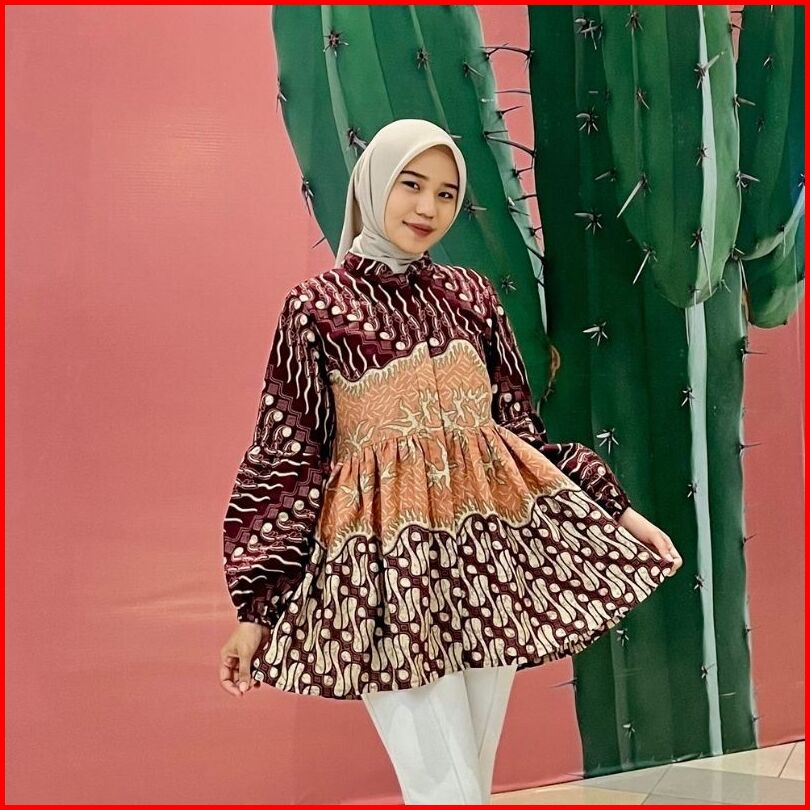 Rasaraya Batik Helvi Blouse Wanita Katun - Atasan Batik Kantor Navy Burgundy Lengan Balon