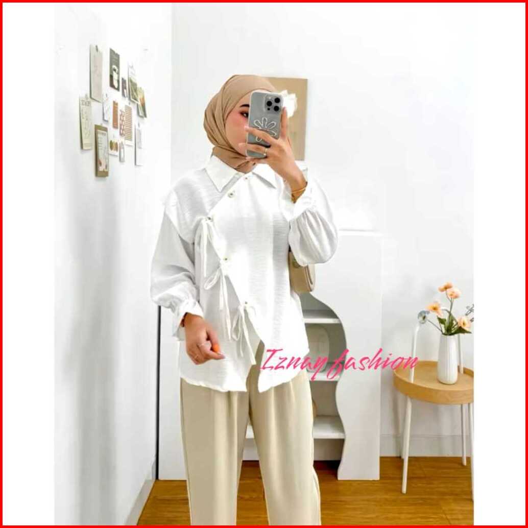 Iznay Fashion - Alma Blouse Polo Linen Kemeja Korea Style Full Kancing Tali Pita Lengan Panjang