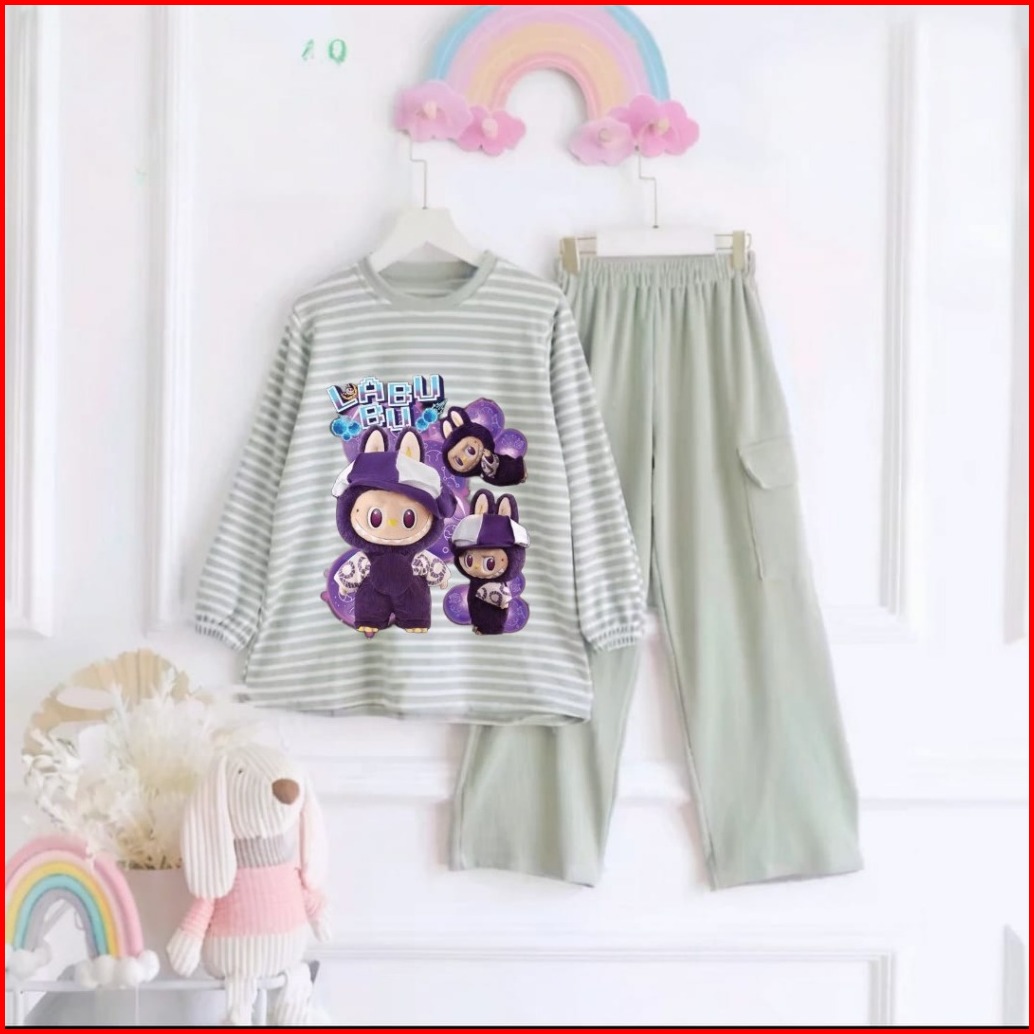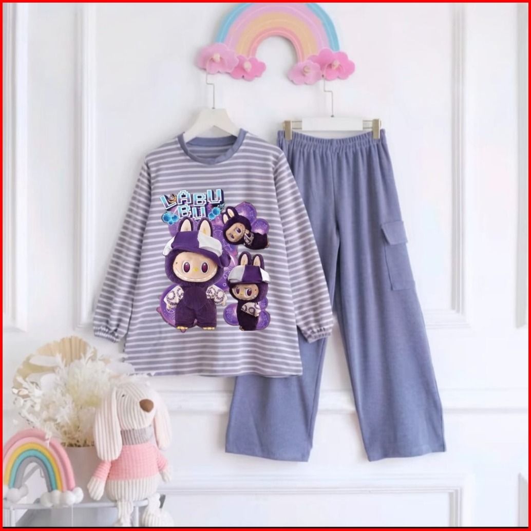 Setelan Anak Perempuan Motif Labubu Bahan Salur Knit Mix Crinkle Terbaru Viral Kekinian
