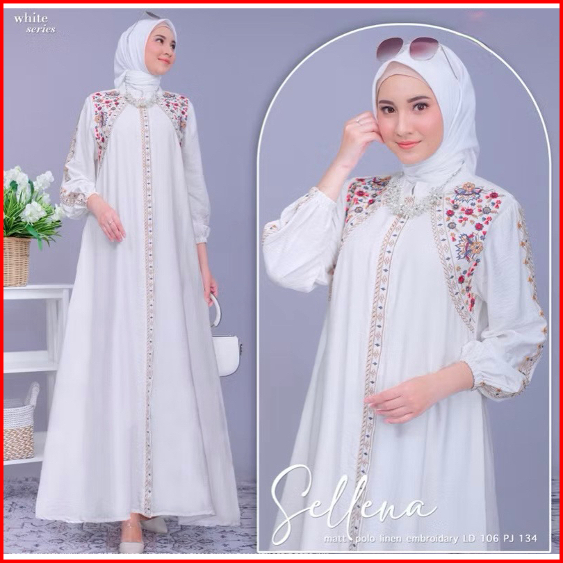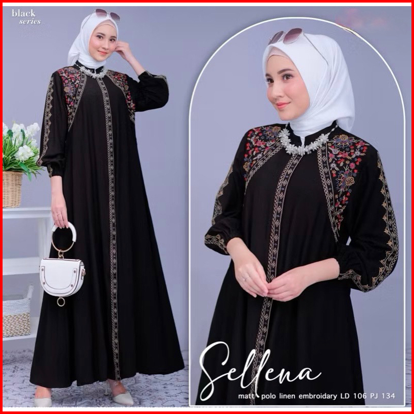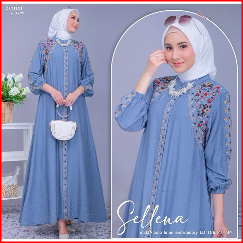 Geneaby - Sellena Gamis Dress Wanita Muslimah Bahan Polo Linen Mix Bordir Emboidery Timbul Mewah Lebaran