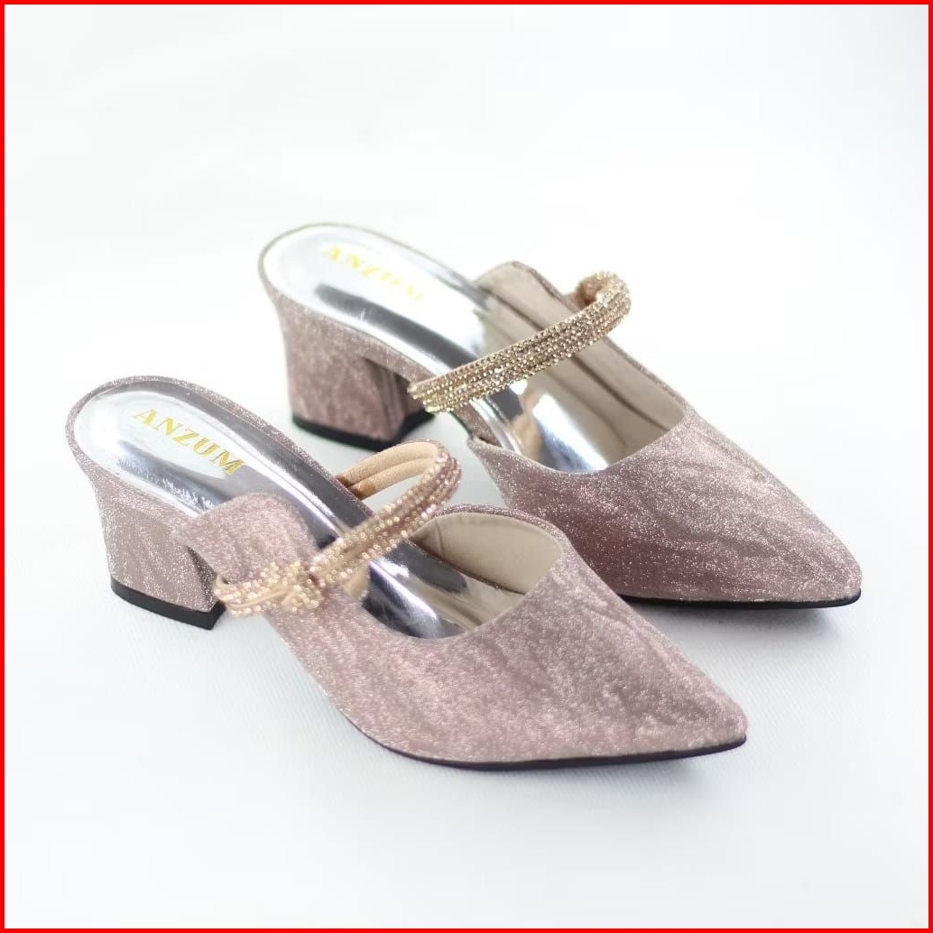 Clara Sandal Mules Wanita Heels Pesta 5cm Bahan Manik-manik Sparkly