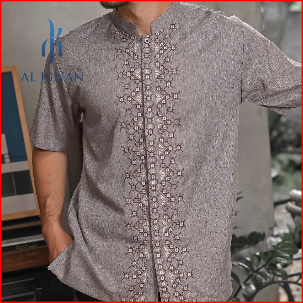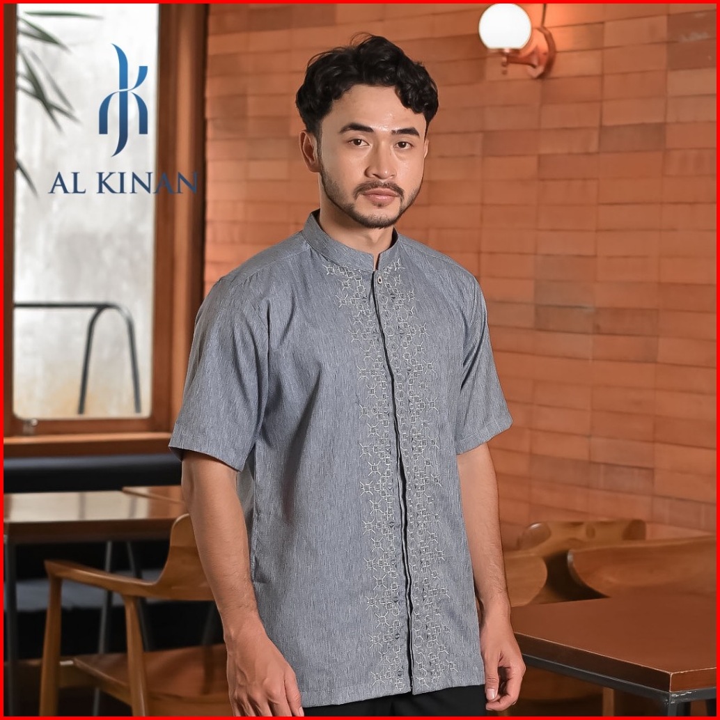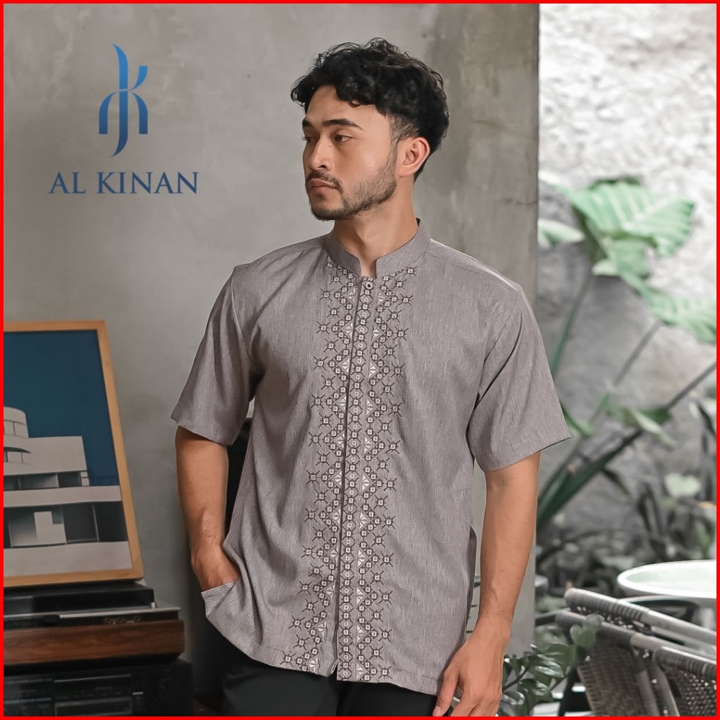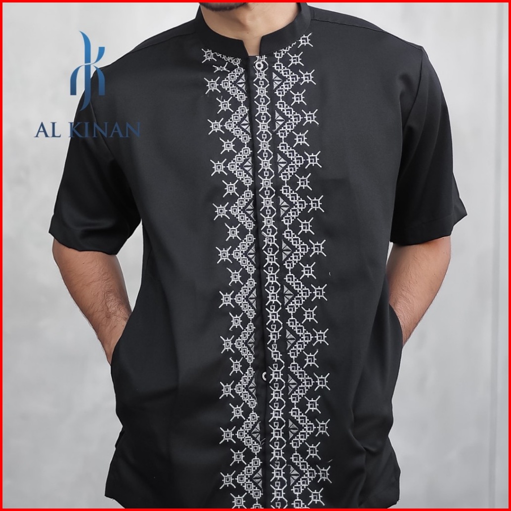Alkinan Baju Koko Muslim Pria Lengan Pendek Katun Madina Motif Bordir Simpel Warna Ak059