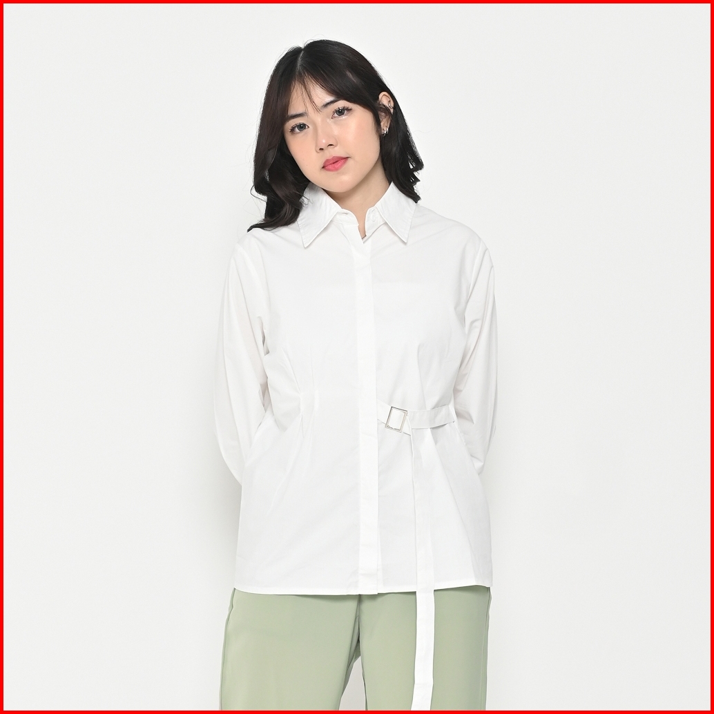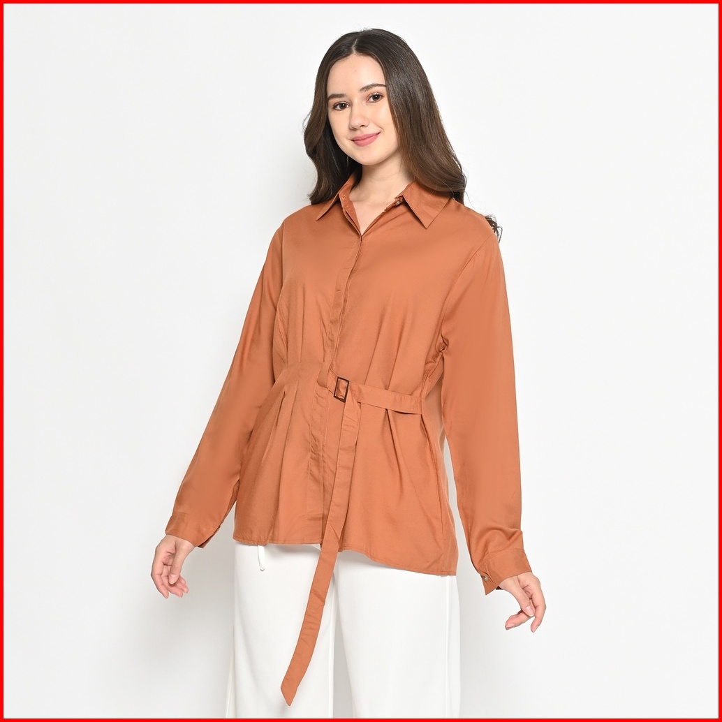 Queentin Kemeja Wanita Half Belt 0469 Cotton Wash Polos Lengan Panjang
