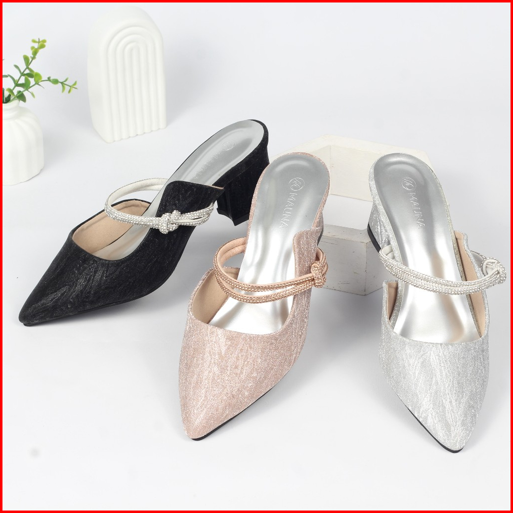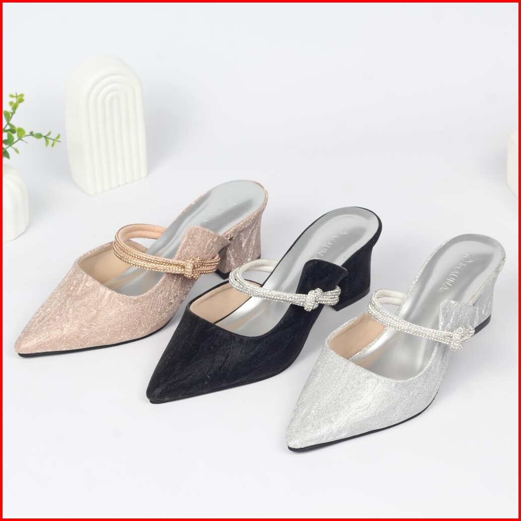 Mauna Aurora Sepatu Pesta Wanita Tali Pita Depan Mules Heels Wanita Glitter Hak 5 Cm Mn01