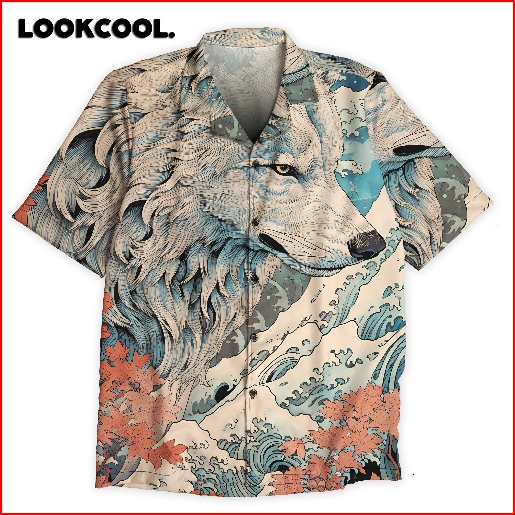 Lookcool Kemeja Motif Serigala Putih Hawaian Style Santai Cowok Cewek