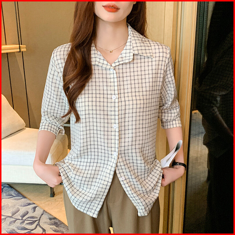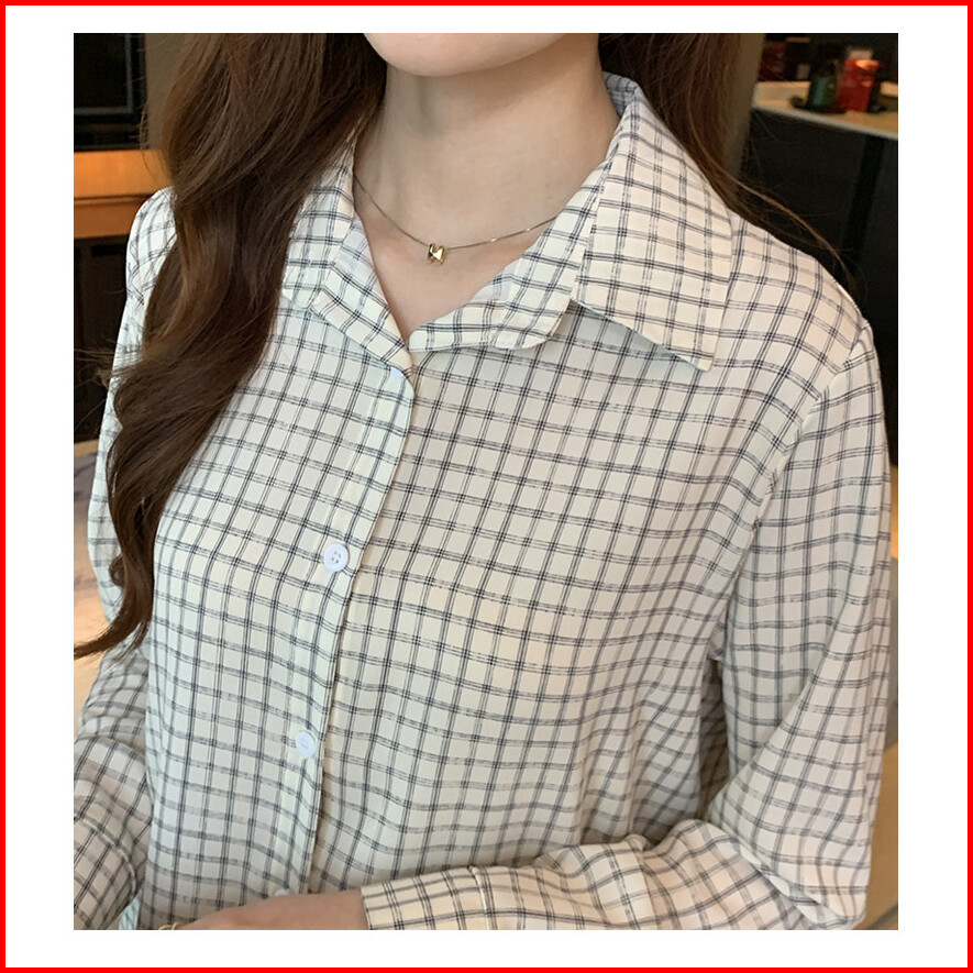 Tianshun Fashion Memeriksa Kasual Longgar Lengan Panjang Sifon Kotak-kotak Kemeja Versi Korea Wanita