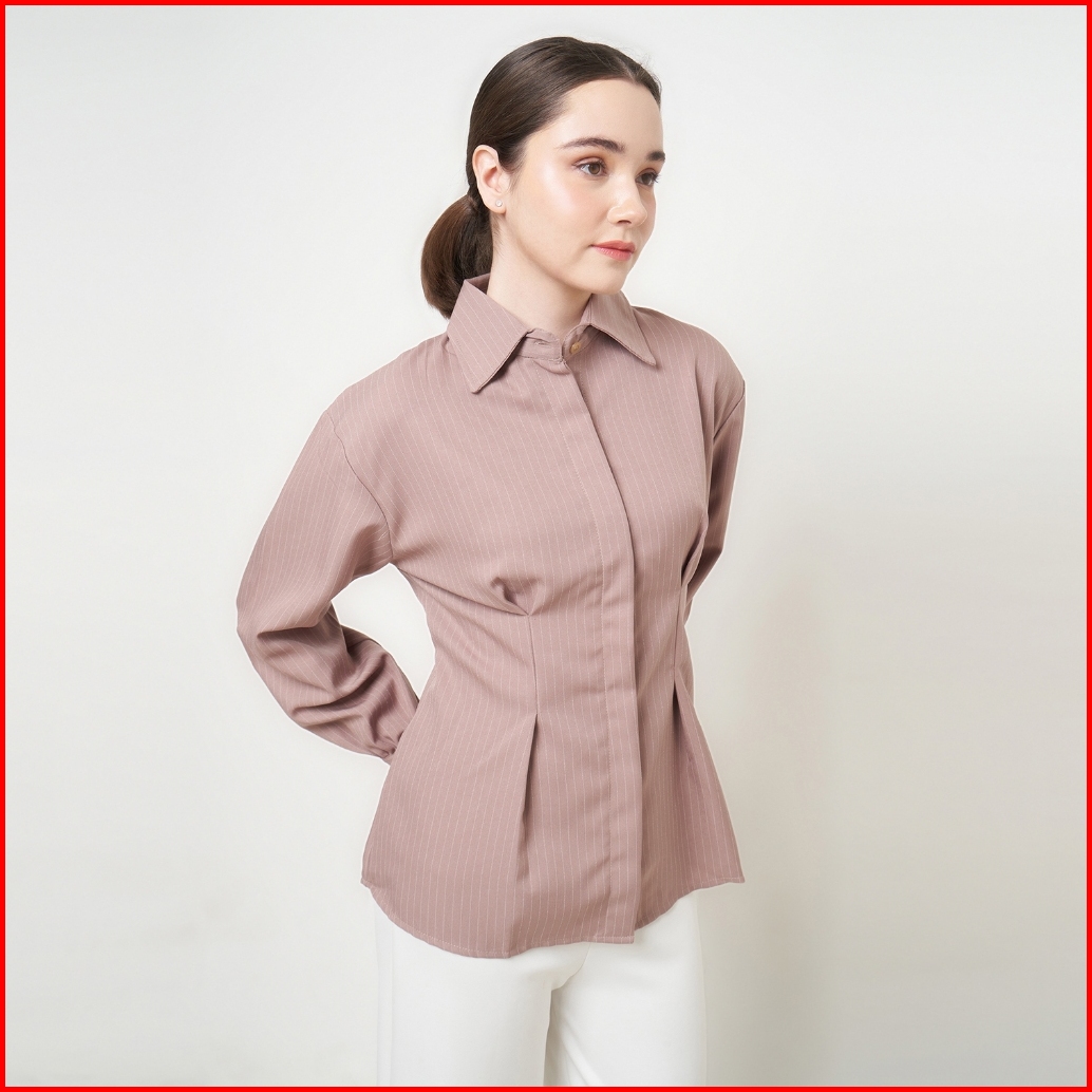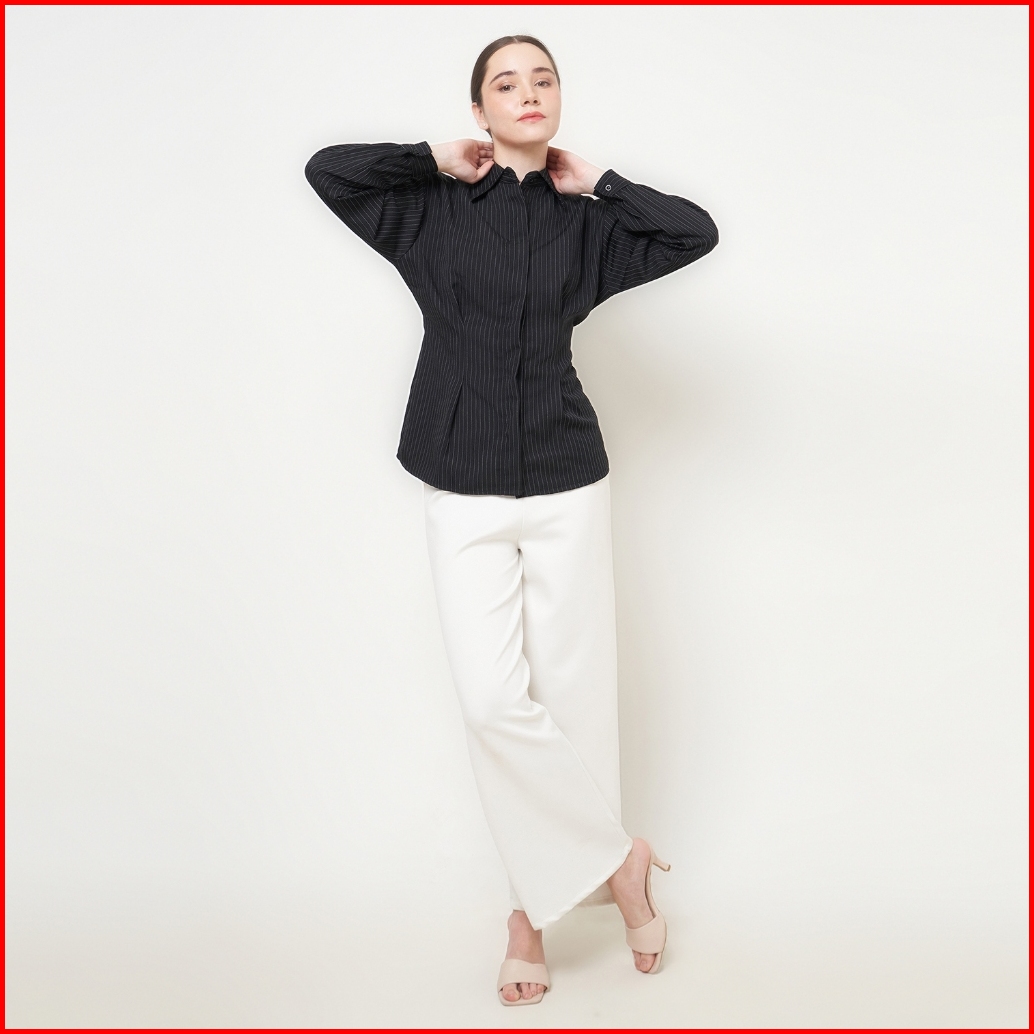Yuglo - Kemeja Wanita Fitted Stripe Salur Basic Casual Atasan Wanita Lengan Panjang Kemeja04