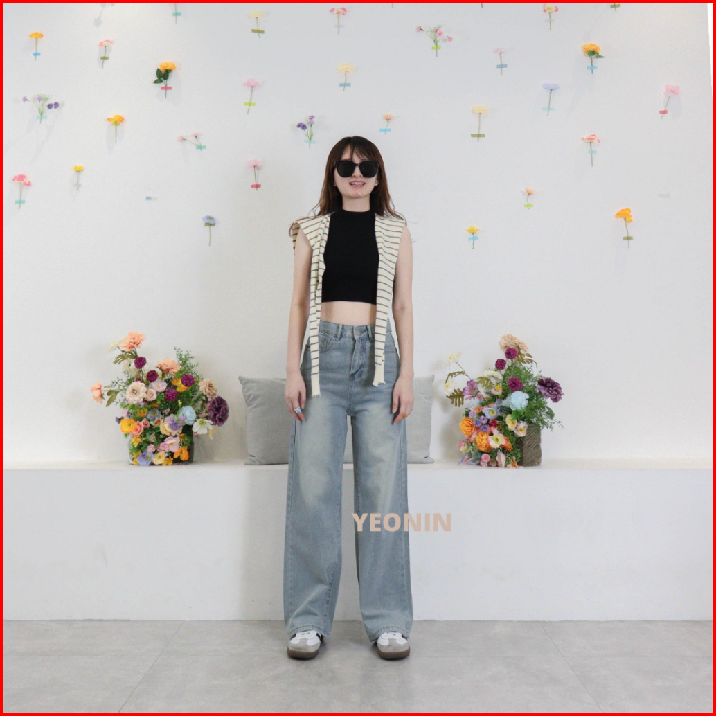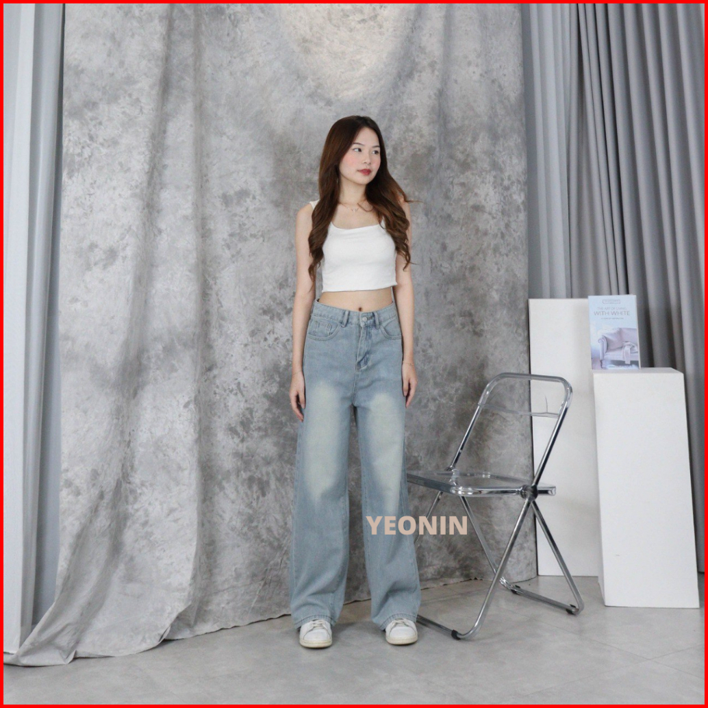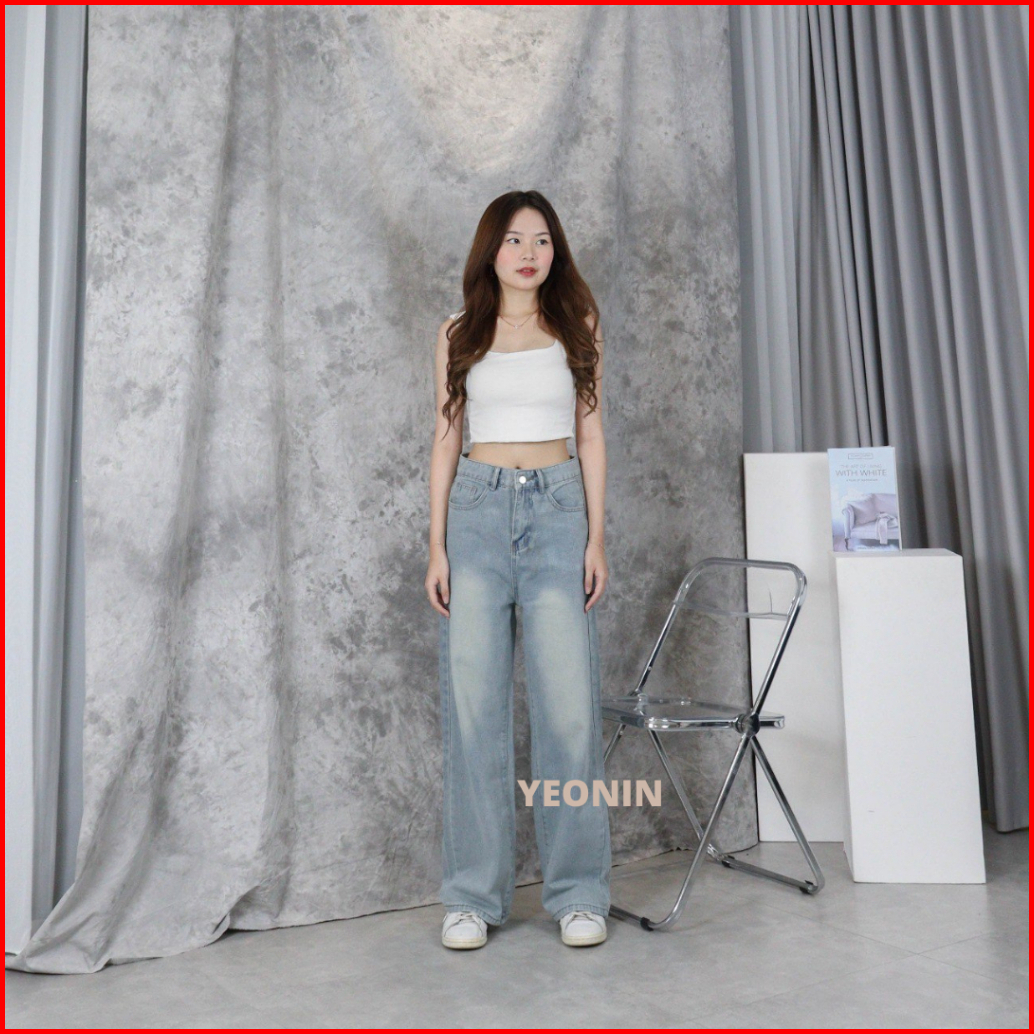 X308 Yeonin Celana Panjang Wanita High Waist Straight Cut Jeans Demin Cewek Baggy Light Blue Washed Jeans Korea Kekinian