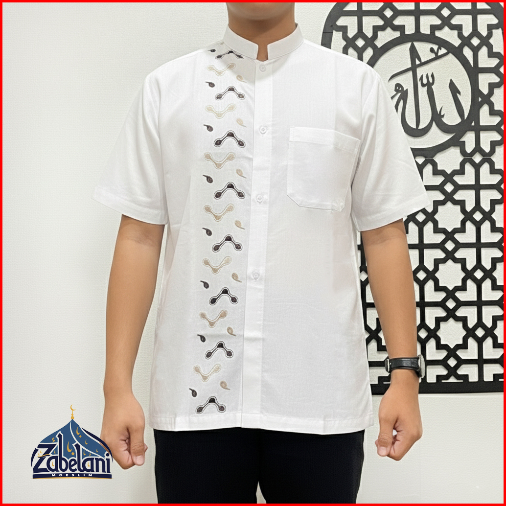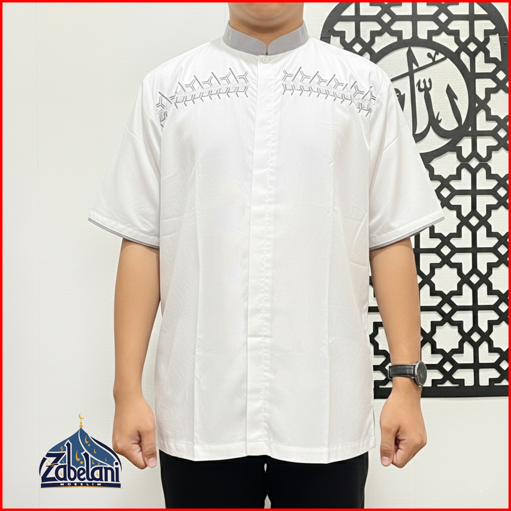 Baju Koko Bordir Muslim Pria Dewasa Kekinian Modern Lengan Pendek Bahan Polykatun Warna Putih Tulang Bw