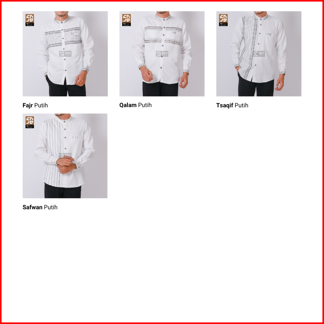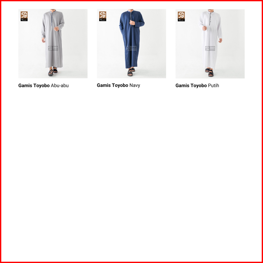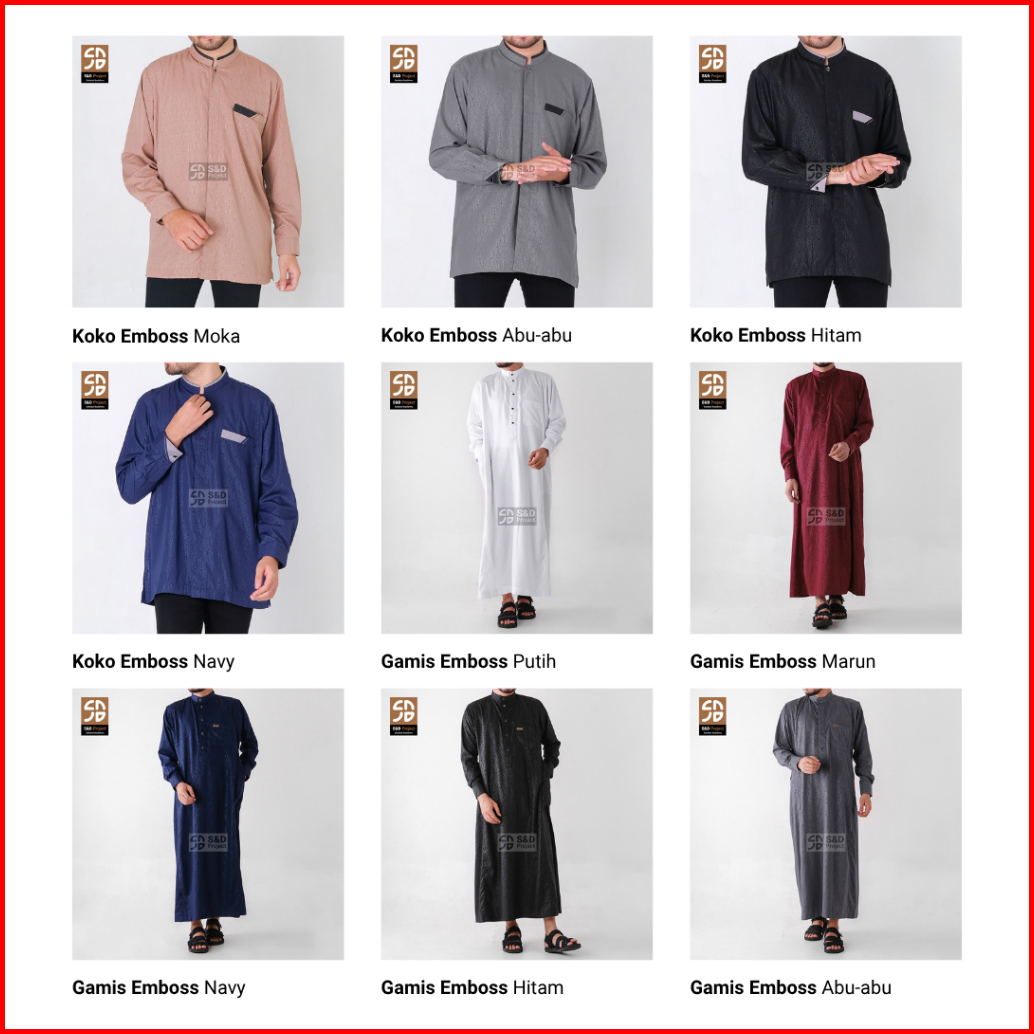 Emboss LPJG Abu 2XL, Emboss LPJG Hitam M, Emboss LPJG Navy L, Toyobo Hitam-Abu M, Toyobo Navy-Abu S, Tyb 04 HItam-Abu M, Toyobo Anak Abu 15, Set Toyobo Putih M, Pangsi Panjang M, Salahudin Al Ayubi M, Ali bin Abi Thalib, Sajadah Kotak Merah, Sajadah Abu Kebiruan, Toyobo 04 Putih L, Pangsi Pendek M, Ziyan Putih M, Ziyan Putih L, Seri 20 Anak 2thn, Seri 20 Anak 4thn, Seri 20 Anak 6thn, Seri 20 Anak 8hn, Seri 24 Anak 10thn, Toyobo 04 Hitam M, Toyobo 04 Navy 2XL, Set Toyobo Hitam XL, Madinah Coklat 2XL