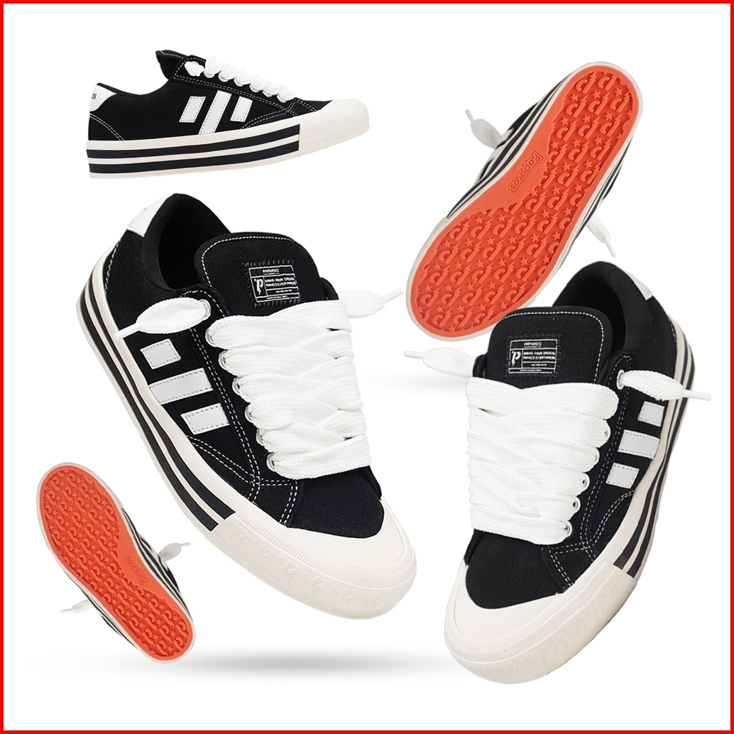 Paparos Sepatu Sneakers Pria Montage Series Black White Model Gemuk Bulky Canvas Casual Shoes Hitam