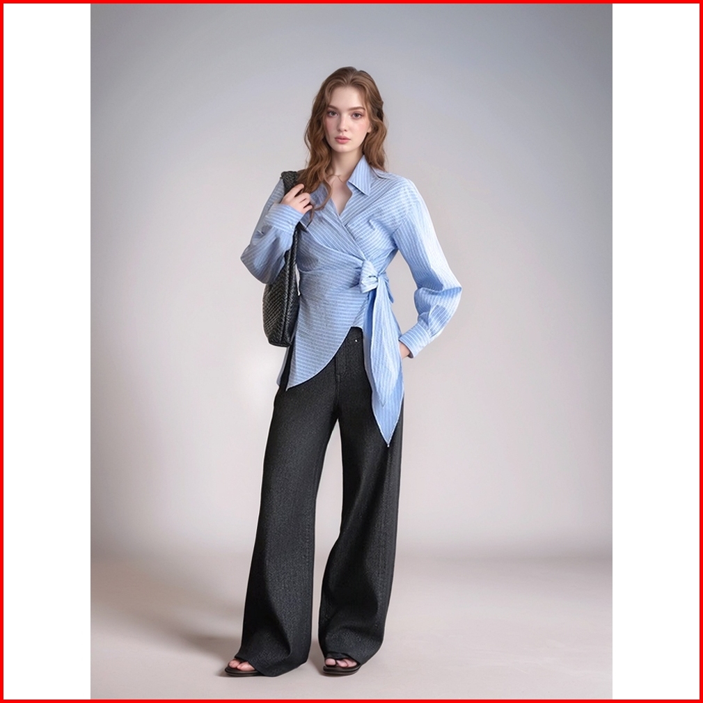Riod Aoer Kemeja Ramping Temperamen Unik Garis-garis Biru Korea Wanita Musim Semi Dan Musim Panas Baru Atasan Pinggang T