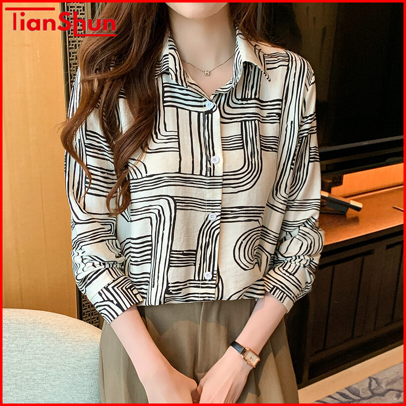 Tianshun Kemeja Sifon Kasual Longgar Wanita Versi Korea Pola Geometris Lengan Panjang Sederhana
