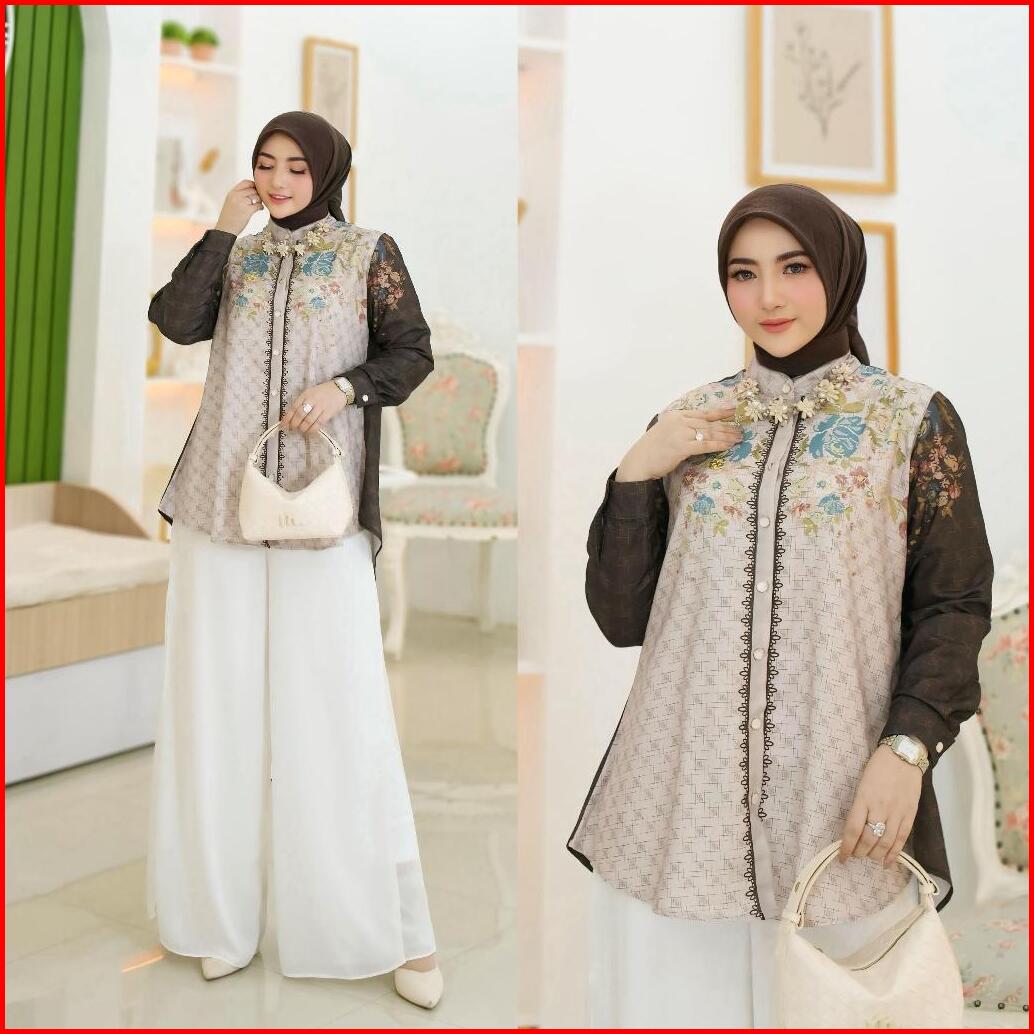 Belifi Kalyca Embellished Shirt Atasan Kemeja Wanita Motif Etnik Kombinasi Baju Kerja Kantor