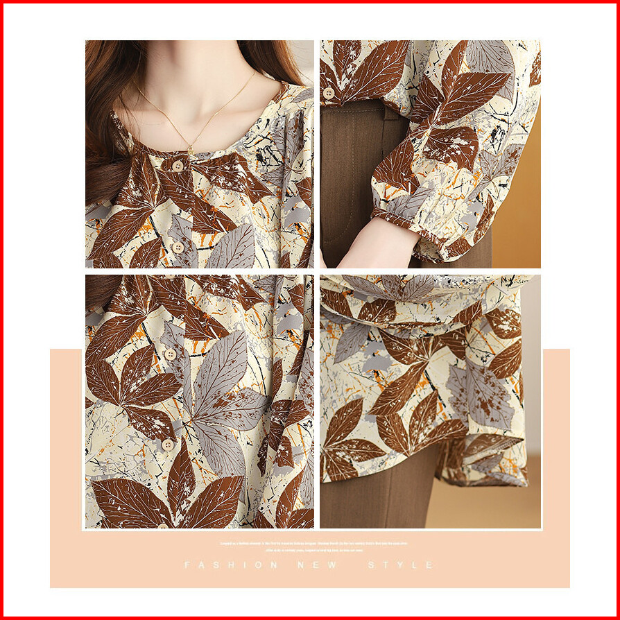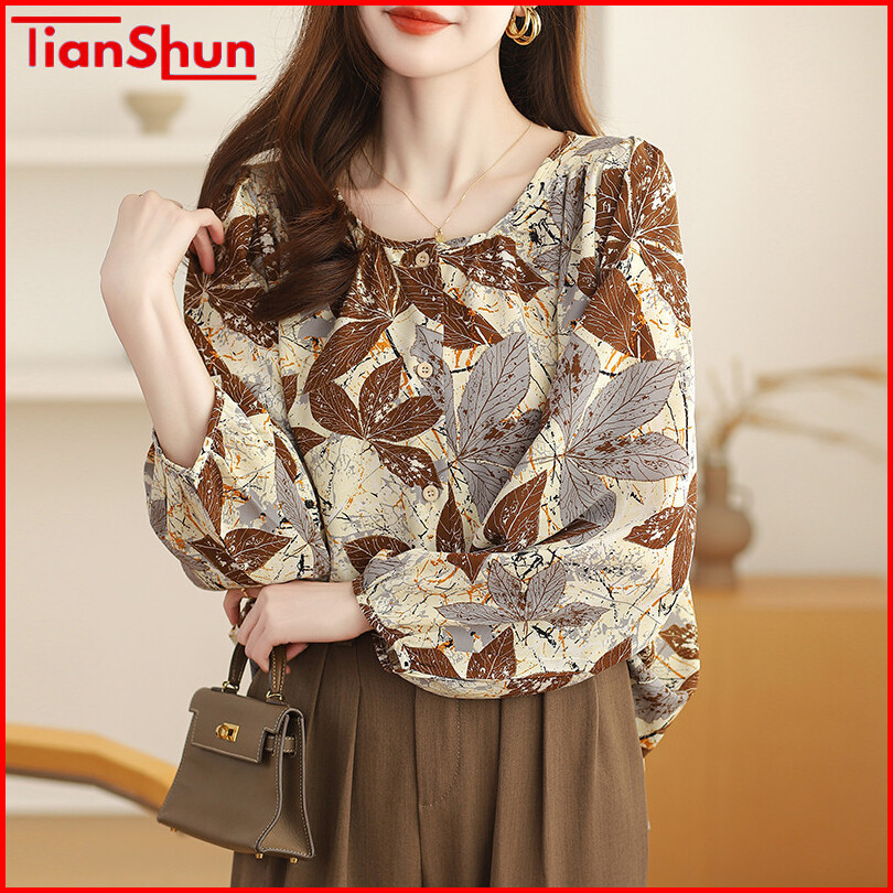 Tianshun Women S Thailand Maple Leaf Printed Long-sleeved Round Neck Shirt Casual Fashion Tops