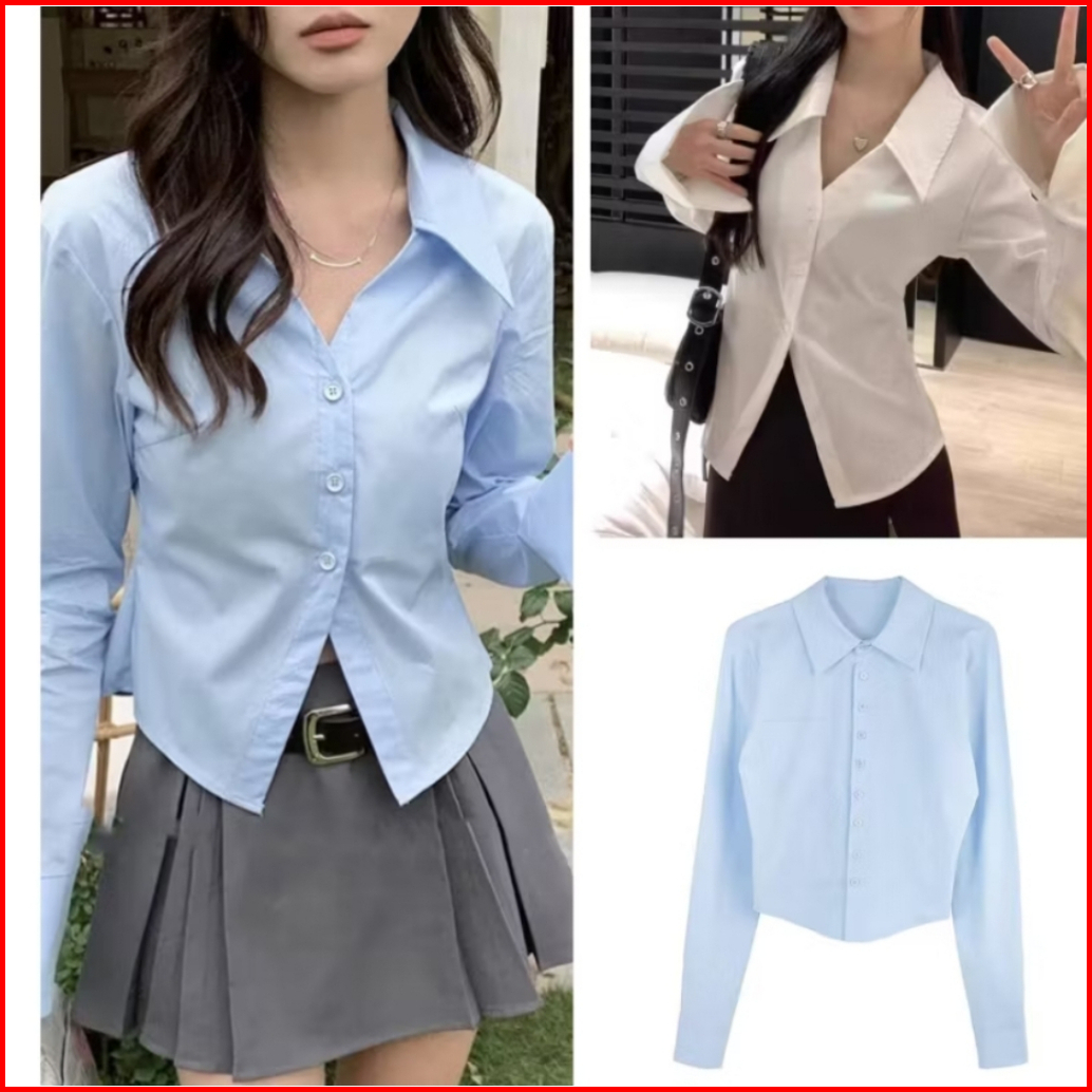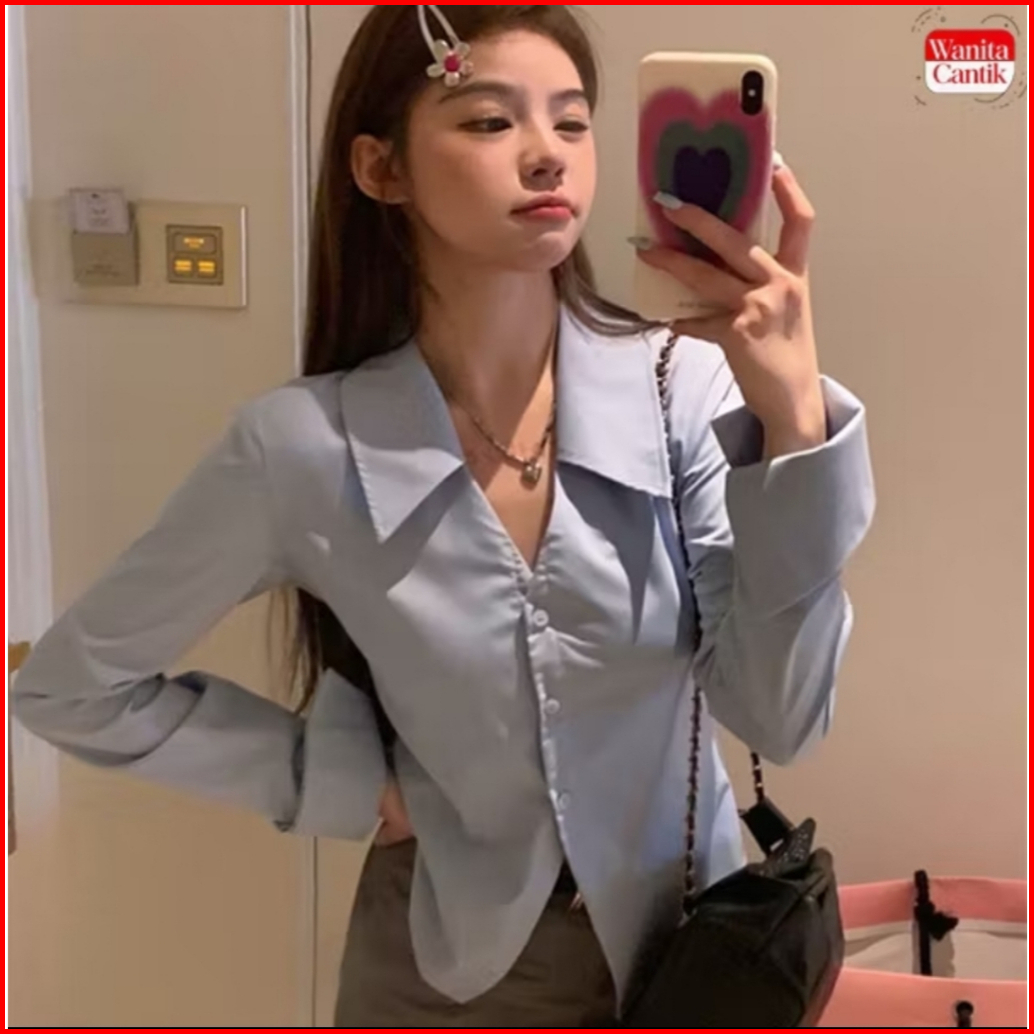 Kemeja Fit Body Lengan Panjang Kemeja Wanita Slim Fit V-neck Gaya Korea