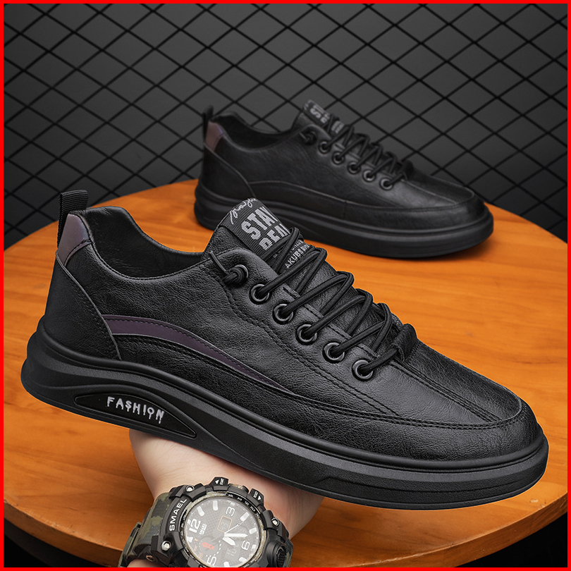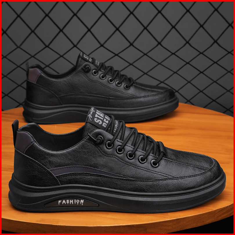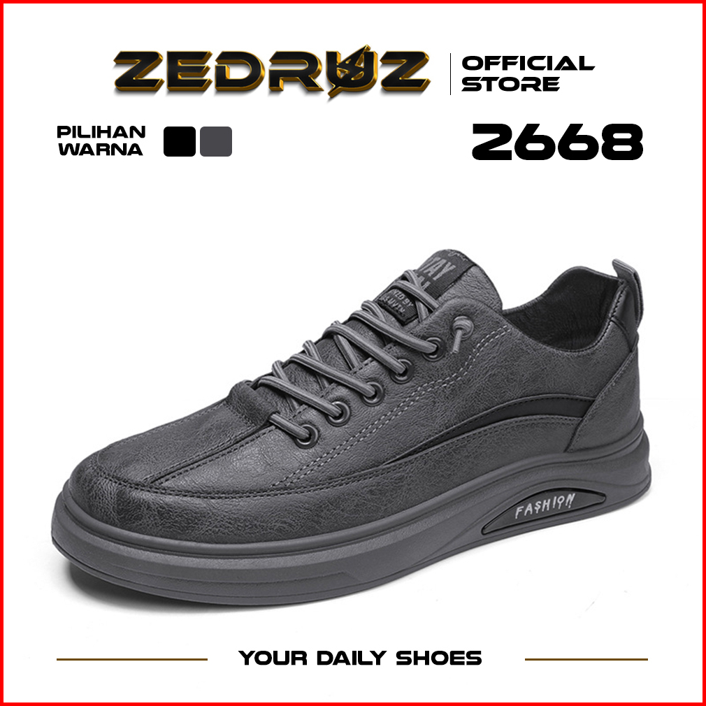 Zedruz Sepatu Pria Kulit Sneakers Kasual Kekinian Sepatu Kerja Tali Sepatu Remaja Hitam 2668
