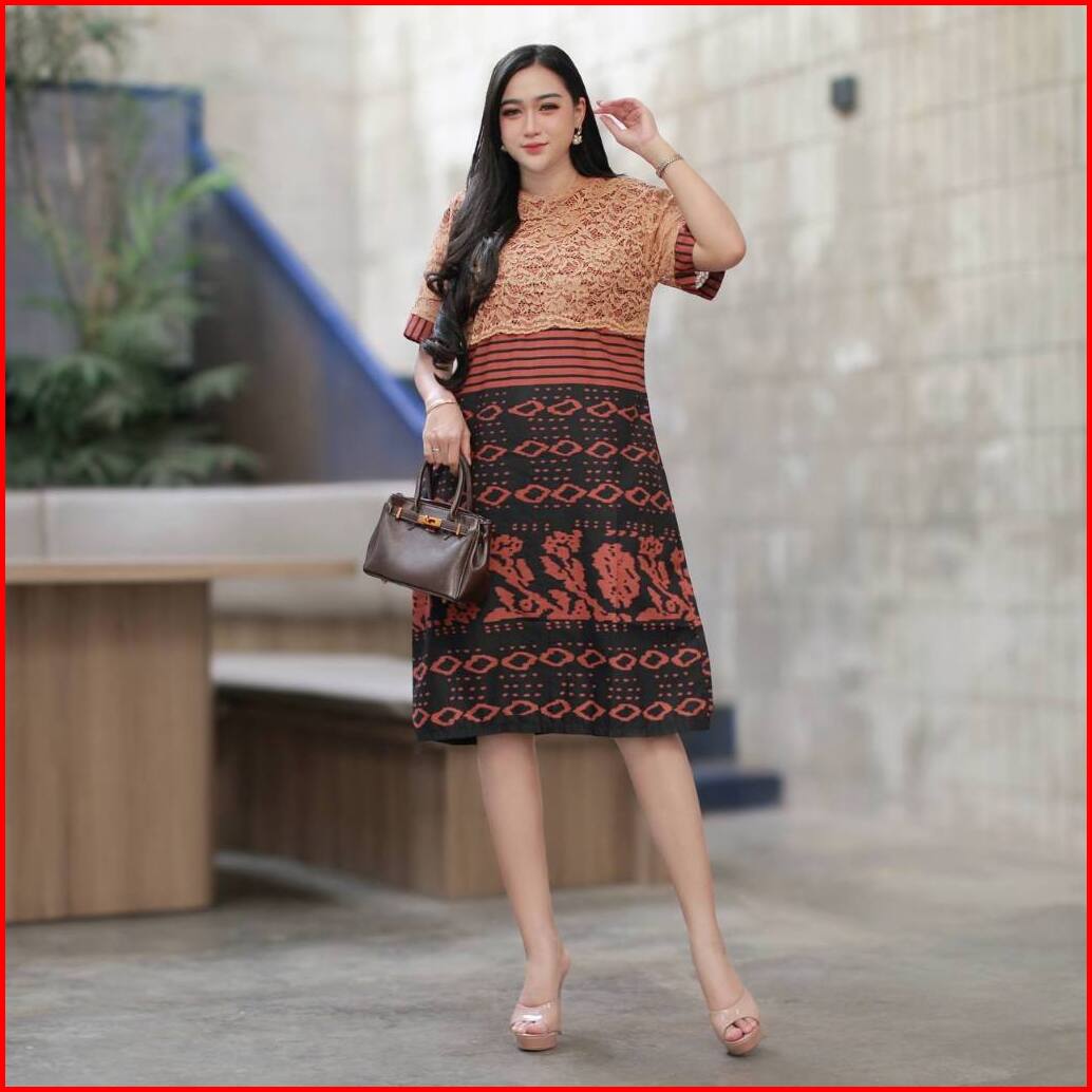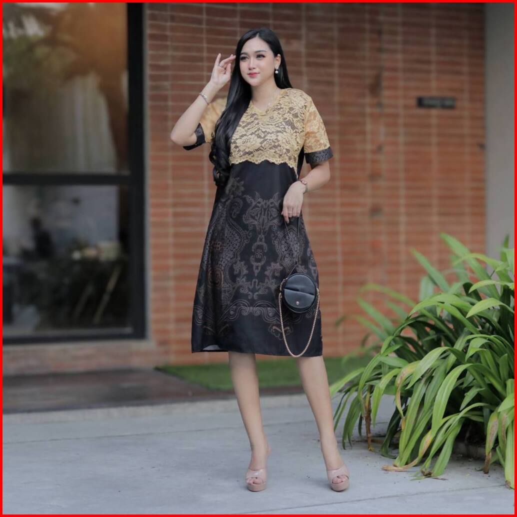Keishan.id - Dress Batik Wanita Lengan Pendek Katun Kombinasi Brokat Casual Kekinian Untuk Natal Kondangan