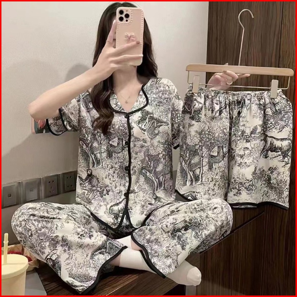 Cessy Baju Tidur Piyama Wanita Import Set 3in1 Adem Dipakai Seharian Bahan Katun Premium 008