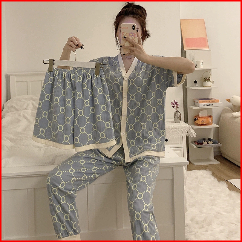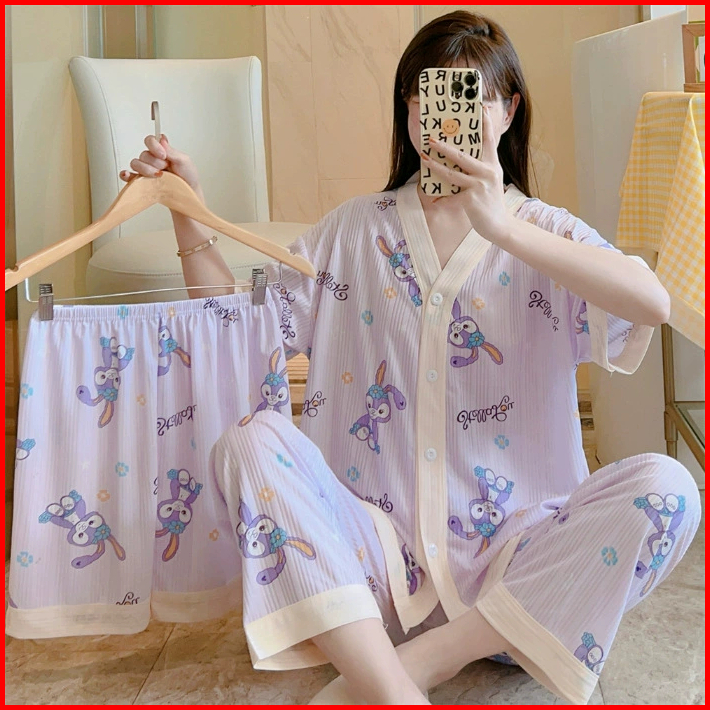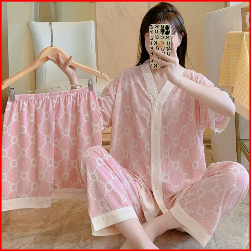 Nona Piyama Baju Tidur Wanita 3in1 Piyama Lengan Pendek Celana Panjang Pendek Premium 013