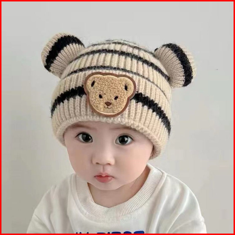 Leleoncare Topi Rajut Bear Boogie Baby Topi Kupluk Bayi Pompom Bulat Boogie Baby Topi Kupluk Anak Motif Salur Bea
