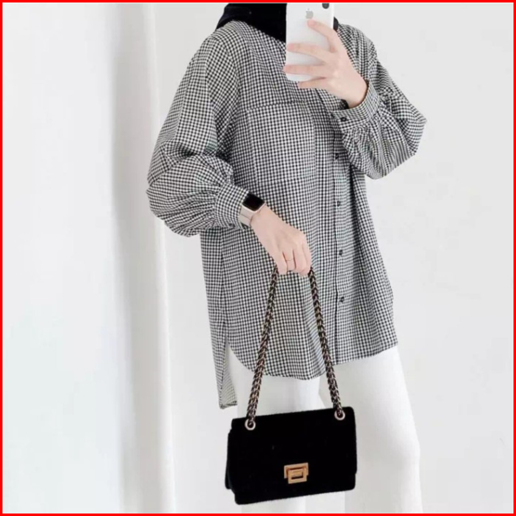 Ayla Tunik Kotak Wanita Atasan Tunik Kasual Lengan Panjang Kancing Depan Aktif Saku Kanan Bahan Katun Adem Fit Xl