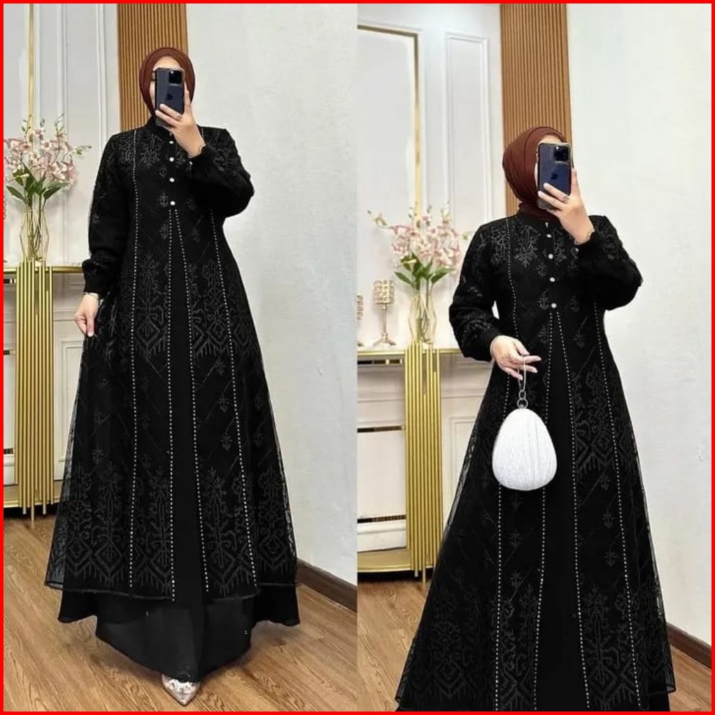 Dress Mahogany Denara Bahan Ceruty Babydoll Mix Brukat Swarovski Gamis Pesta Mewah Kondangan